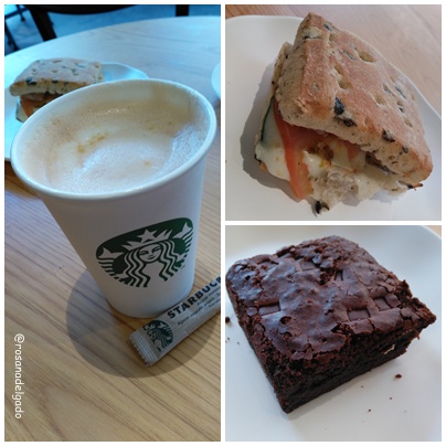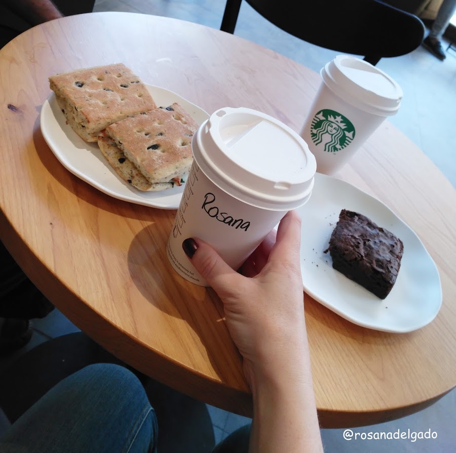 Y después de dar un repaso al entorno, me centraré en lo más importante... ¡el café!. Como primera incursión en la casa, pedí un sencillo y efectivo café con leche (hay que decir, para quien no los conozca, que el tamaño es más que generoso). Pero no quería dejar de degustar algunas de sus delicias dulces y saladas, así que me decanté por una sabrosa focaccia y un brownie... ¡en honor a la verdad, el mejor que he probado en mucho tiempo!.