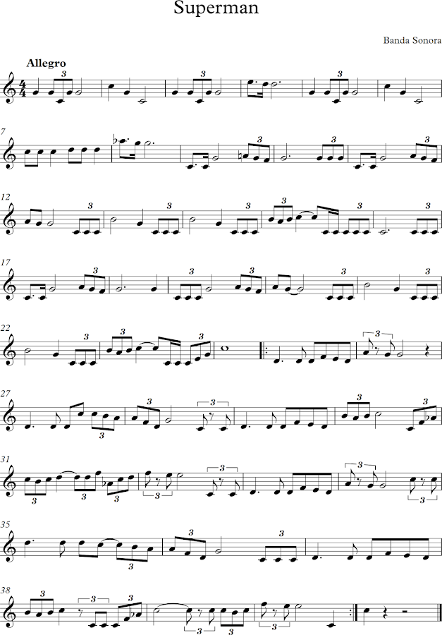 Superman. Partitura para flauta dulce. Partitura de la melodía para la Banda Sonora de Superman. La podemos trabajar a partir de 6º de Primaria.