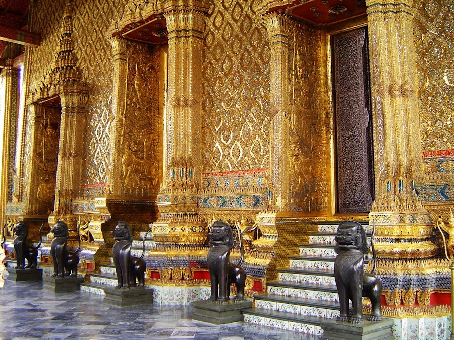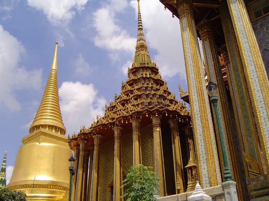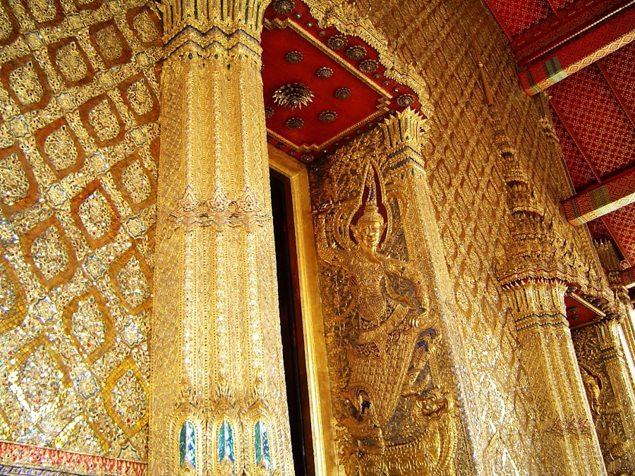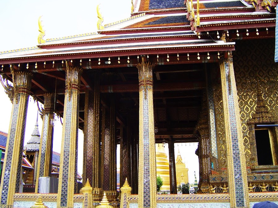 Parte trasera del Wat del Buda Esmeralda. Según la tradición, en 1434 un rayo cayó en un chedi de Chiang Rai, lo que reveló la presencia de un sencillo buda de estuco. Pero el yeso se cayó y descubrió una imagen de Buda hecha en jade. Sólo mide 66 x 48 cms y está colocada en el interior de una urna de cristal encima de un altar dorado.