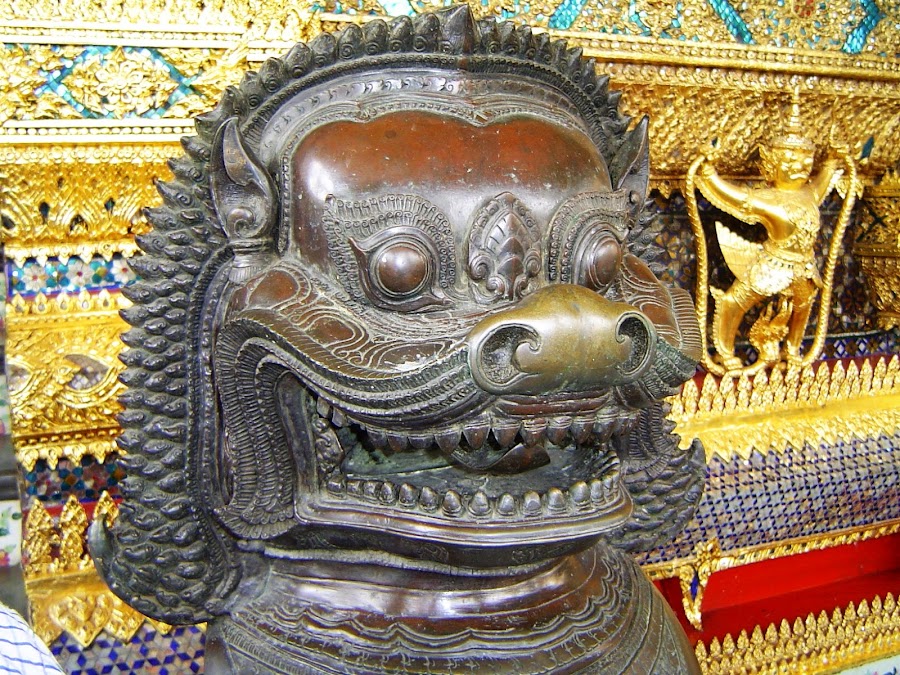 Uno de los leones que vigilan la entrada al bot del Buda Esmeralda, en el que no se podían sacar fotos.