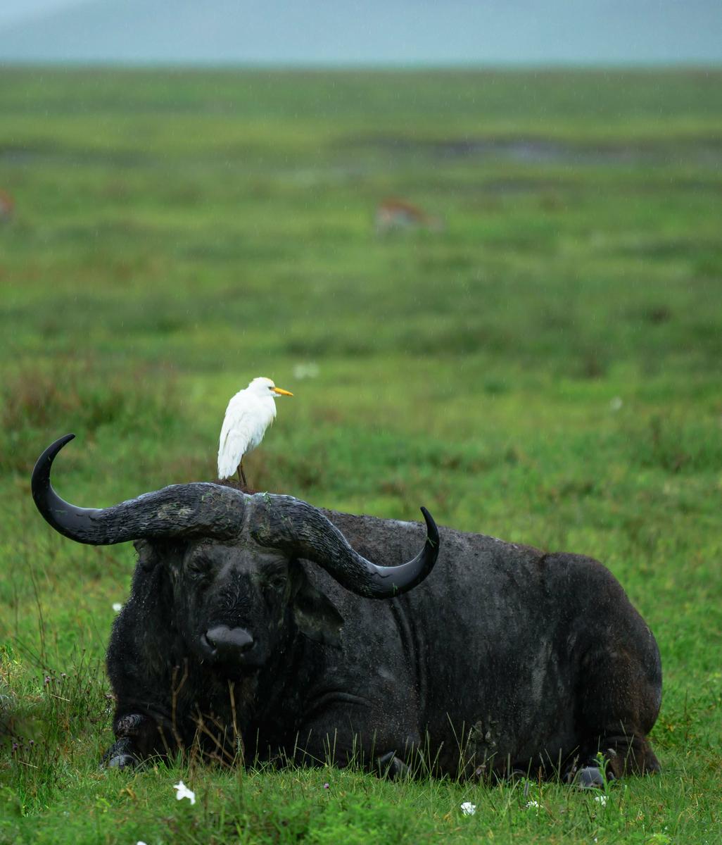 Este no es el típico pajaropicabueyes, el parasito más común entre los búfalos. No obstante seguro que su interes por este búfalo es similar. Aprovecharcse de los organismos que crecen en el búfalo y alimentarse de ellos.