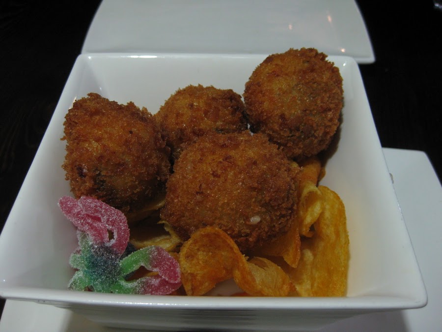 La verdad es que no se como estarán los de jamón y queso, pero estos estaban deliciosos, tenían un sabor muy intenso y se podían ver y degustar perfectamente los trocitos de setas. Me encanta que las croquetas sepan a lo que dicen que llevan, que por desgracia no en todas partes es así. Por cierto, las gominolas que incluyen los platos eran parte de la ambientación de halloween.