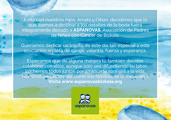 Hoy es día de post y nada me hace más feliz que volver a hablar de Aspanovas y de la nueva propuesta de colaboración de la que os hablaba hace poco. Sí, hablo de diseñar cositas de boda a cambio de un donativo a la Asociación de Padres con Niños con Cáncer de Bizkaia. Podéis volver a leer el post aquí.