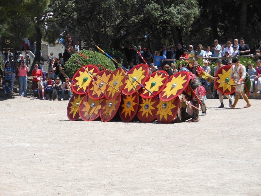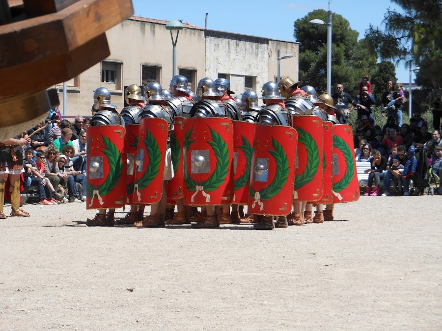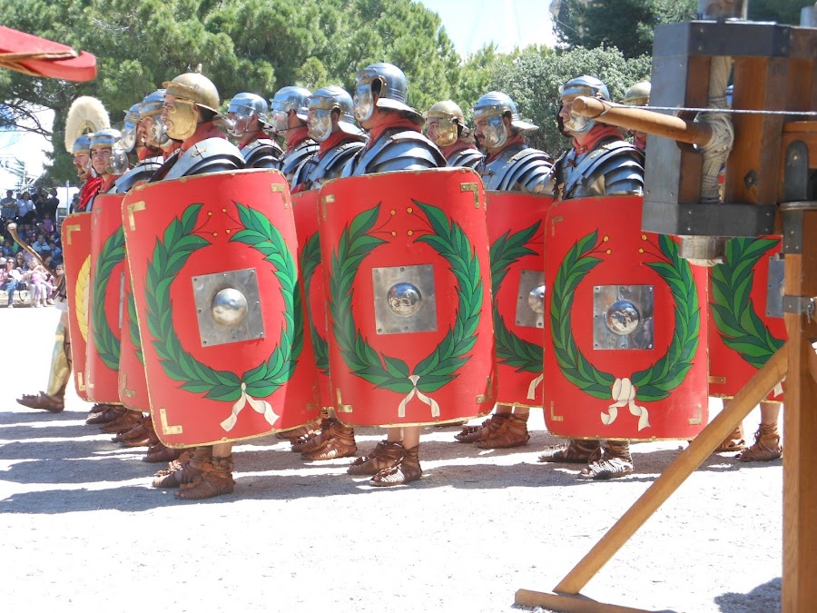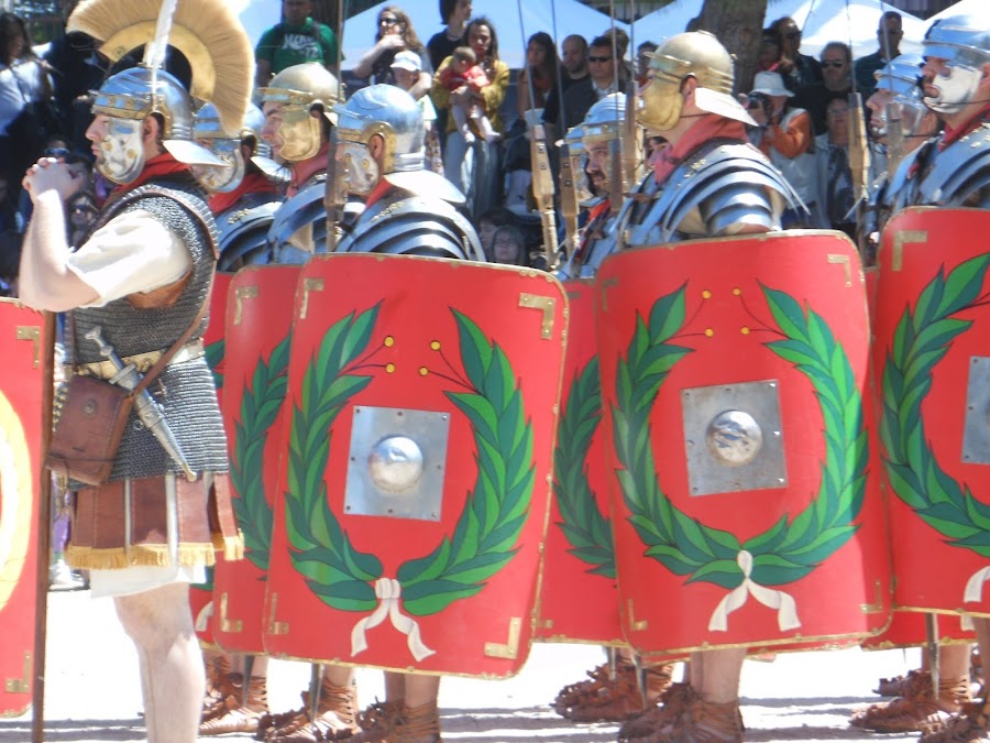 Llegaron los legionarios, completamente protegidos por sus grandes escudos en forma de teja, sus cascos, con protección para las orejas y alero en la nuca que podía descansar sobre su armadura hecha a base de tiras de hierro movibles según los gestos del soldado