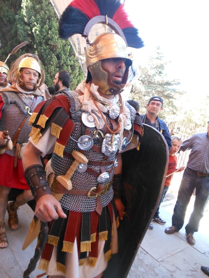 volvieron a llegar las legiones, para comprobar que la ciudad seguía en paz, y como vereis a través de los siglos en que perduraron los romanos en la península sus artes de guerra fueron cambiando y sustituyendo sus uniformes y escudos, èstos pasaron a ser más pequeños y redondos, para que fueran más ligeros a los ataques de la caballería, sus lanzas más largas, y sustituyeron la antigua armadura por la cota de malla, que a pesar de sus 20 kgs. era mucho más ligera y cómoda