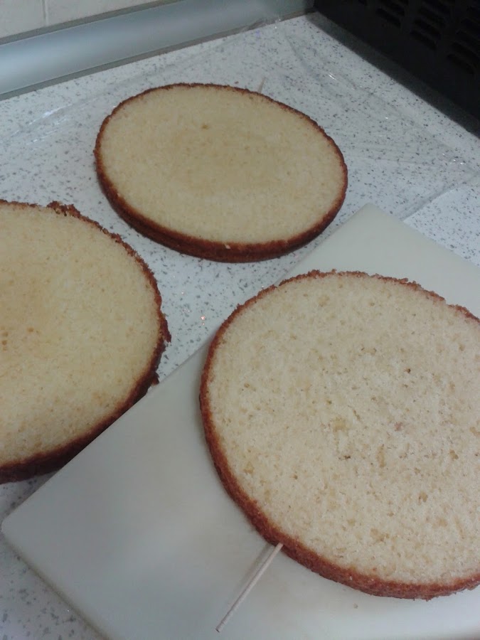 Tendremos que cortar con un cuchillo de sierra la parte abultada del bizcocho para que nos quede lo más plano posible y le daremos la vuelta para que la parte de abajo del bizcocho, que es la que queda mejor se convierta en la parte de arriba, así conseguiremos un mejor resultado al decorarlo.