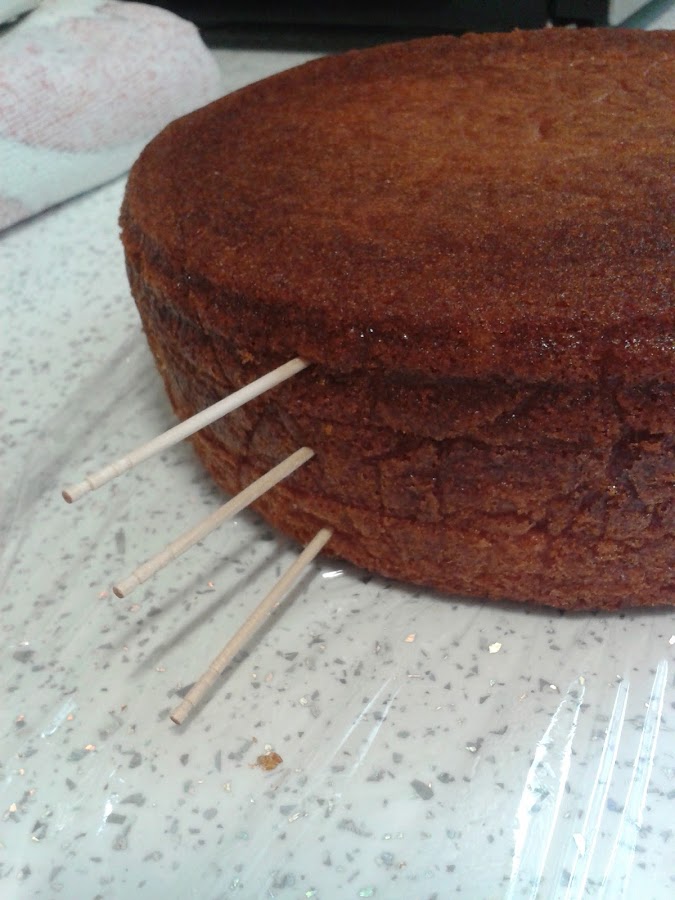 El ganaché es muy fácil de hacer pero para que realmente quede cremoso y perfecto para utilizar tiene que estar frío, lo ideal es que se enfríe a temperatura ambiente por ello te recomiendo que sea lo primero que hagas, antes de preparar el bizcocho. Si lo haces el día anterior y lo tienes que meter en la nevera, deberás sacarlo para que se caliente a temperatura ambiente porque en la nevera se quedará demasiado duro para poder utilizarlo. Para rellenar nuestro bizcocho, lo partimos en tres partes, tal como veis en las fotos, poned unos palillos en fila, para después volver a juntarlo por el mismo sitio, así siempre os quedará perfecto.