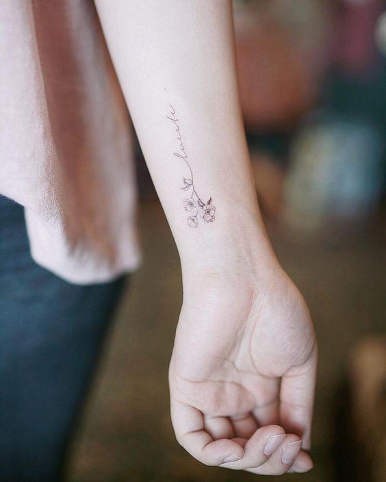 Estos diseños de tatuajes combinan algún tipo de flor con alguna palabra o nombre en diferentes tipografías creando un hermoso tatuaje minimalista.