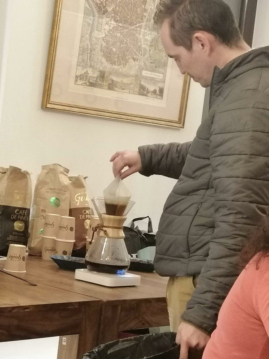 En cuanto a los cafés, contamos con los estupendos cafés Guilis. Degustamos las variedades de México, Colombia y Brasil. Todos ellos cafés naturales de la mejor calidad tostados en Alcorcón (Madrid), y nos enseñaron cómo degustarlos para sacarles el mayor aroma: al estilo antiguo, dejando caer el agua sin presión con el filtro y, por supuesto, recién molido.