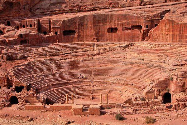 Fue originalmente construido por los nabateos (no los romanos) hace más de 2000 años. El teatro fue cincelado de la roca, cortando a través de muchas cuevas y tumbas en el proceso. Fue ampliado por los romanos para albergar alrededor de 8500 personas poco después de llegar en el año 106. Dañado por un terremoto en el año 363 DC, el teatro fue parcialmente desmantelado para construir otras estructuras, pero sigue siendo un lugar destacado de la Ciudad de Petra.