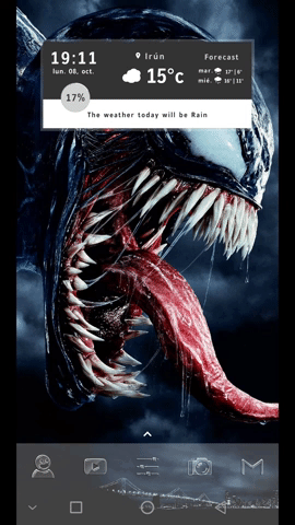 Este pequeño GIF que vemos aquí arriba corresponde al mencionado theme de Venom. Se trata de un tema oscuro, con iconos tipo cristal transparente y un par de widgets que le cierto aire “neoyorkino“.