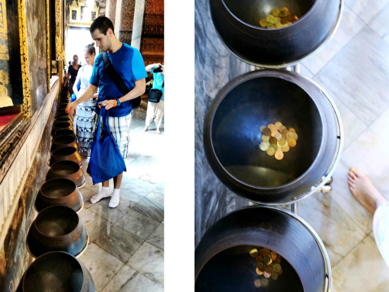 moneditas de limosna en los 108 cuencos metálicos pensando que trae buena
