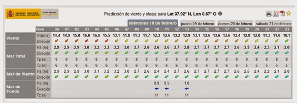 En estos días pasados, la situación ha cambiado, encontrándonos bajo la influencia de una BORRASCA situada sobre el sur del mediterraneo (en el norte de África), con algunas lluvias, temperaturas más suaves, y sobre todo fuertes vientos de LEVANTE, que llegan a alcanzar la intensidad de FUERZA 7 en la Escala BEAUFORT. Si bien la situación invernal predominante es la descrita anteriormente, todos los años suele haber un temporal (o dos) de levante por estas fechas.