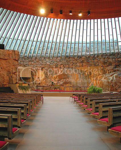 Como la estancia iba a ser de dos días nada más, había escogido lo más sobresaliente del lugar: la Iglesia de la Roca o de Piedra por ser un monumento de lo más original que se puede encontrar. Diseñada y terminada en 1969 por los hermanos Timo y Tuomo Suomalainen quienes aprovecharon el desnivel de la propia tierra para construir una iglesia subterránea con una cúpula que sobresale a modo de OVNI aparcado en medio de la ciudad. La estructura superficial se puede ver desde el balcón habilitado para ello lo que sorprende a propios y extraños por sus dimensiones y el color verde azulado que lo caracteriza aunque este color puede tomar muchas variaciones según luz que lo ilumine. Y más sorprendente es bajar los escalones y encontrarse lo que es la entrada de la Iglesia que más bien parece la de un bunker de guerra; tras pasar un oscuro pasillo de lineas y ángulos sobresalientes desembocamos en una sala espléndida llena de lazos entre la propia tierra y el trabajo modernista de los arquitectos que logran congeniar y hermanar dentro del más puro estilo natural la piedra del suelo cavernoso con las ventanas que se cierran y abren a modo de persianas que conformar la cúpula desde el interior dándole el calor del día y haciéndole un templo de recogido tono beige que invita a la oración . El rito es el luterano, así que tenemos que acostumbrarnos a los sermones amplios y llenos de mensajes, aúnan los idiomas para que propios y extranjeros puedan ser testigos de la grandeza de un buen discursos religioso aquí donde no se han perdidos las costumbres de la retórica y el diálogo.