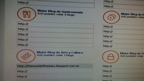2. Una vez registrado e identificado, haz click en Votar (tal y como indica la imagen). Después busca la categoría Mejor Blog de Arte y Cultura y escribe la dirección o URL de este blog, http://theworldoftheduky.blogspot.com.es, después del http:// que ya te encontrarás escrito: