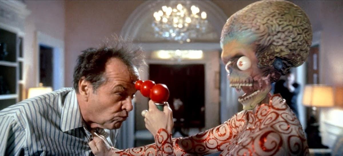 La invasión fue imparable y devastaron todo el mundo, incluida la Casa Blanca, hasta que descubrieron lo que podría matar al gran cerebro y a los extraterrestres con forma de calavera con la canción “Indian Love Call” de Slim Whitman. Sus cabezas explotan tan pronto como lo escuchan. Esta película presenta comedia oscura y sátira política.