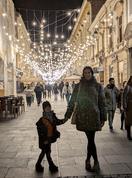 Strada Alba Iulia, la calle peatonal que une Piata Unirii y Piata Victoriei. (la calle de los paraguas de Timisoara). Ahora llena de luces.