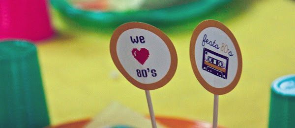 Para la vajilla de nuestra fiesta optamos por el plástico de colores, cuando montas una fiesta de estas características hay dos opciones: algo muy informal y lo más parecido a la realidad de la época o una adaptación súper cuca. Nosotros escogimos la real, plástico de colores, neón, estampados de cebra? El gran acierto unas pegatinas con los ?Toi?? (os acordáis de los tois de los bollycaos??). La pegatina dejaba el espacio en blanco para que cada uno escribiera el ?Toi? que más le apetecía.