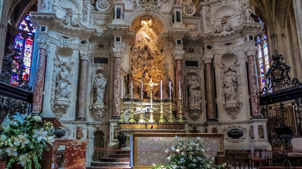 Contrasta su su elegante interior el exterior construido de ladrillo rojo fruto de la restauración que tuvo lugar de 1920 a 1972.