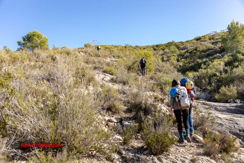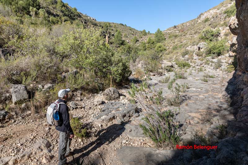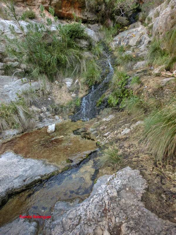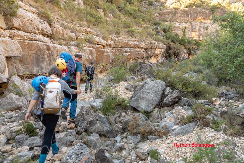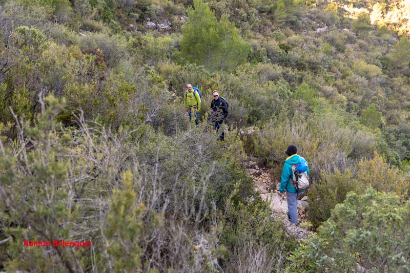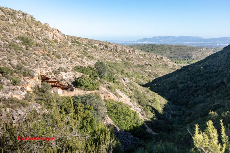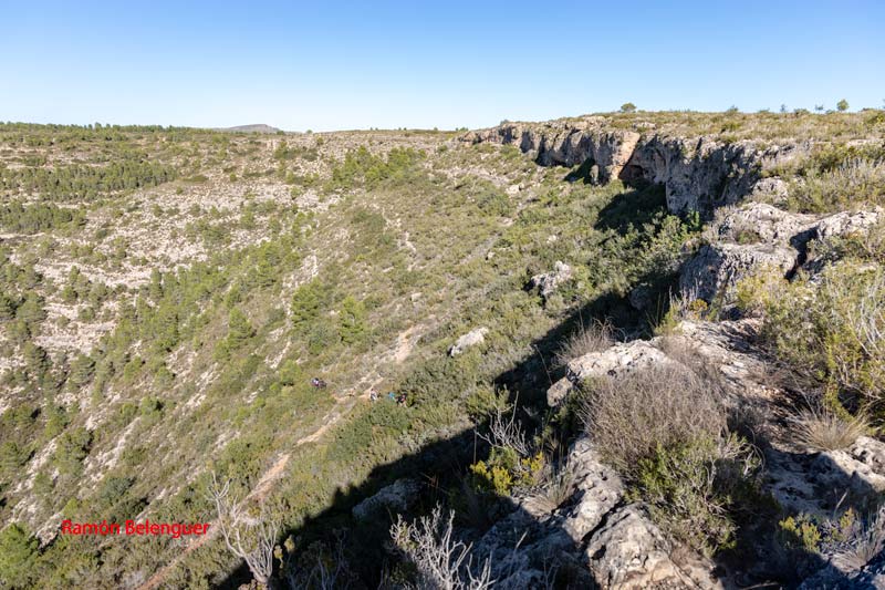 al fondo a la derecha comienzo del barranco del Castellet, primer rapel, nosotros giramos a la izquierda para remontar el barranco, hacia la cueva del Candil