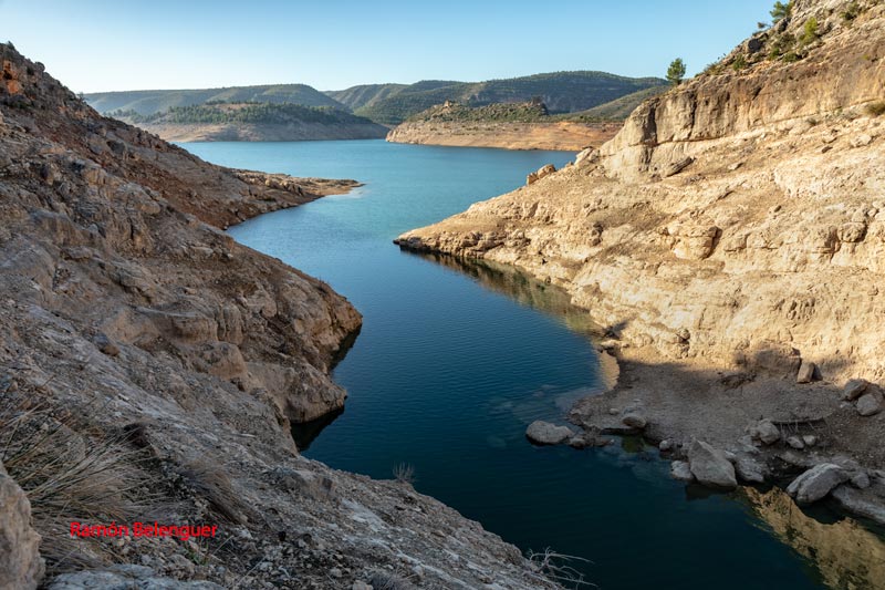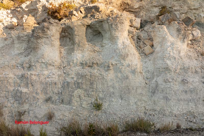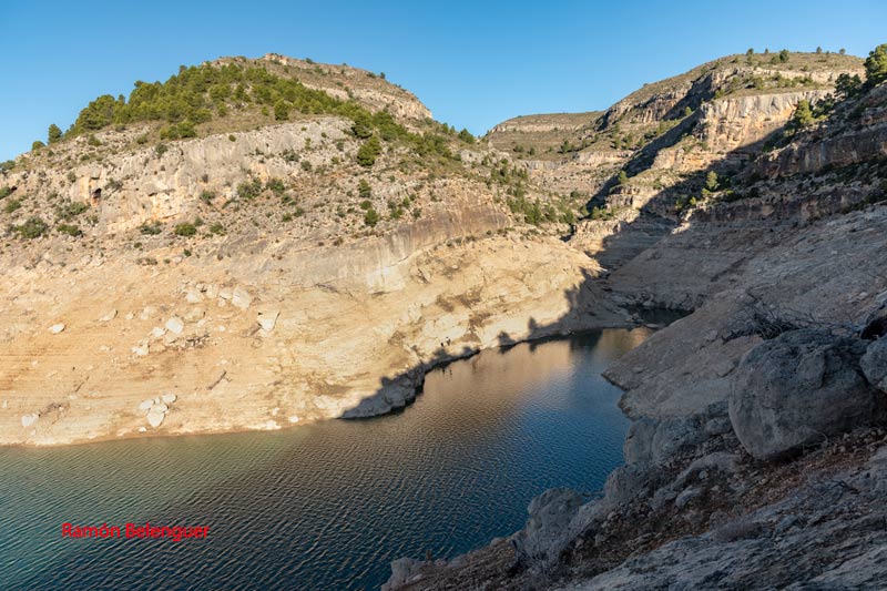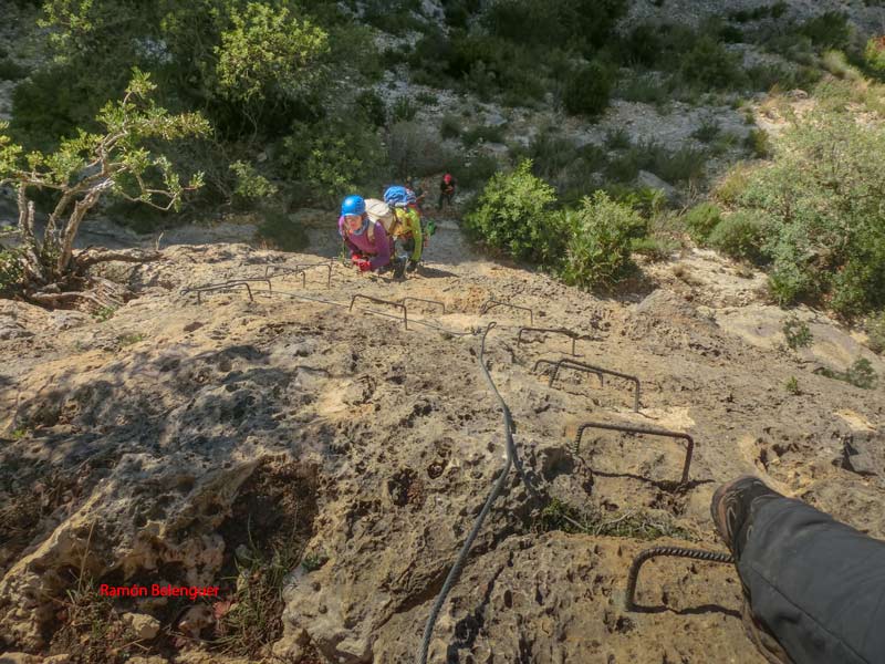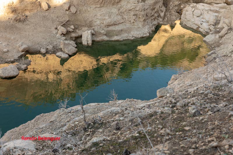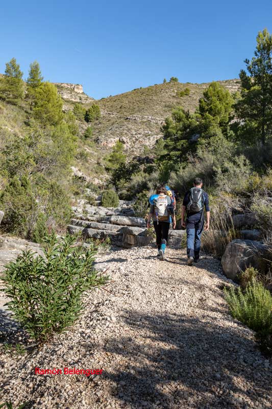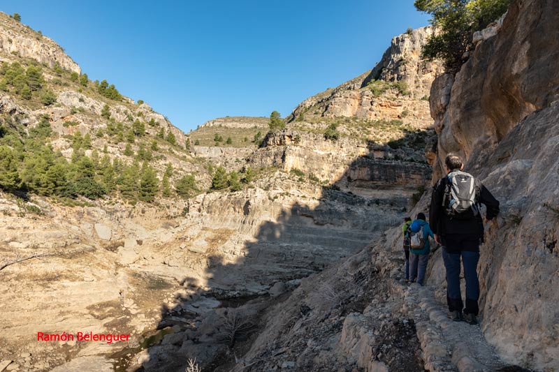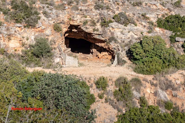 al fondo a la derecha comienzo del barranco del Castellet, primer rapel, nosotros giramos a la izquierda para remontar el barranco, hacia la cueva del Candil