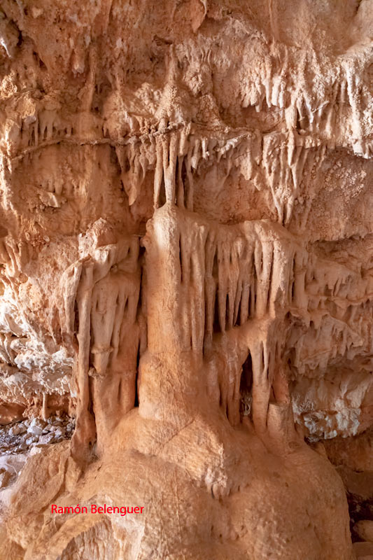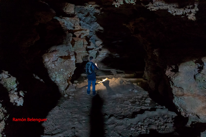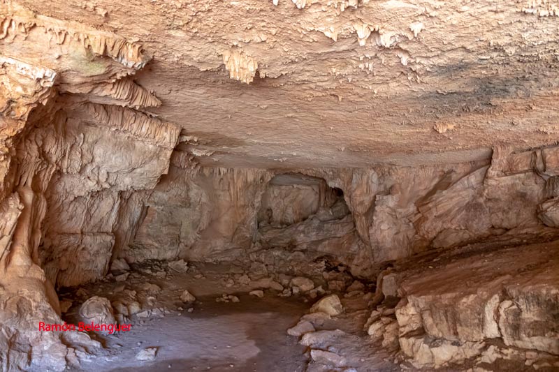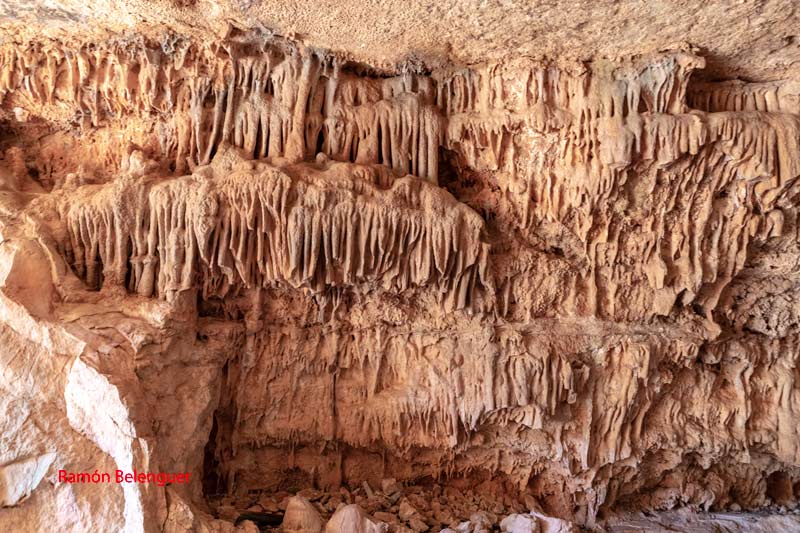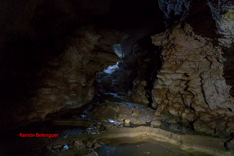 La cueva es el antiguo cauce de un río subterráneo, seco desde hace miles de años, que fue capturada y decapitada por la erosión del barranco en que se halla la boca. En ocasiones podemos encontrar agua en la cavidad, pero se tratará de pequeños charcos, a veces casi lagos, que cubren su suelo de una parte de la galería, a poco de la entrada. La boca, a la altura del techo de la cavidad, da acceso a una rampa de derrubios con un 20% de desnivel, concrecionados sobre un salón que es probablemente el mayor de la cueva. Una de sus características llamativas está precisamente relacionada con esos lagos mencionados, y es la presencia de numerosos y vistosos gours. Algunos son de gran desarrollo, la mayor parte son de apenas veinte cm de altura y con bordes superiores festoneados. Otra característica es el aspecto de las paredes y techos de la cavidad. Las formas de corrosión química se superponen a las de erosión del antiguo río, y junto con una estratigrafía horizontal le confieren a las paredes un aspecto dentado muy característico. En el techo aparecen bóvedas de erosión y otras formas bastante desarrolladas. Un último aspecto a comentar es la presencia de desplomes en varias de las salas de la zona interior de la cavidad. Grandes bloques caídos del techo forman un par de caos de bloques que hacen cambiar un poco la monotonía de la galería.