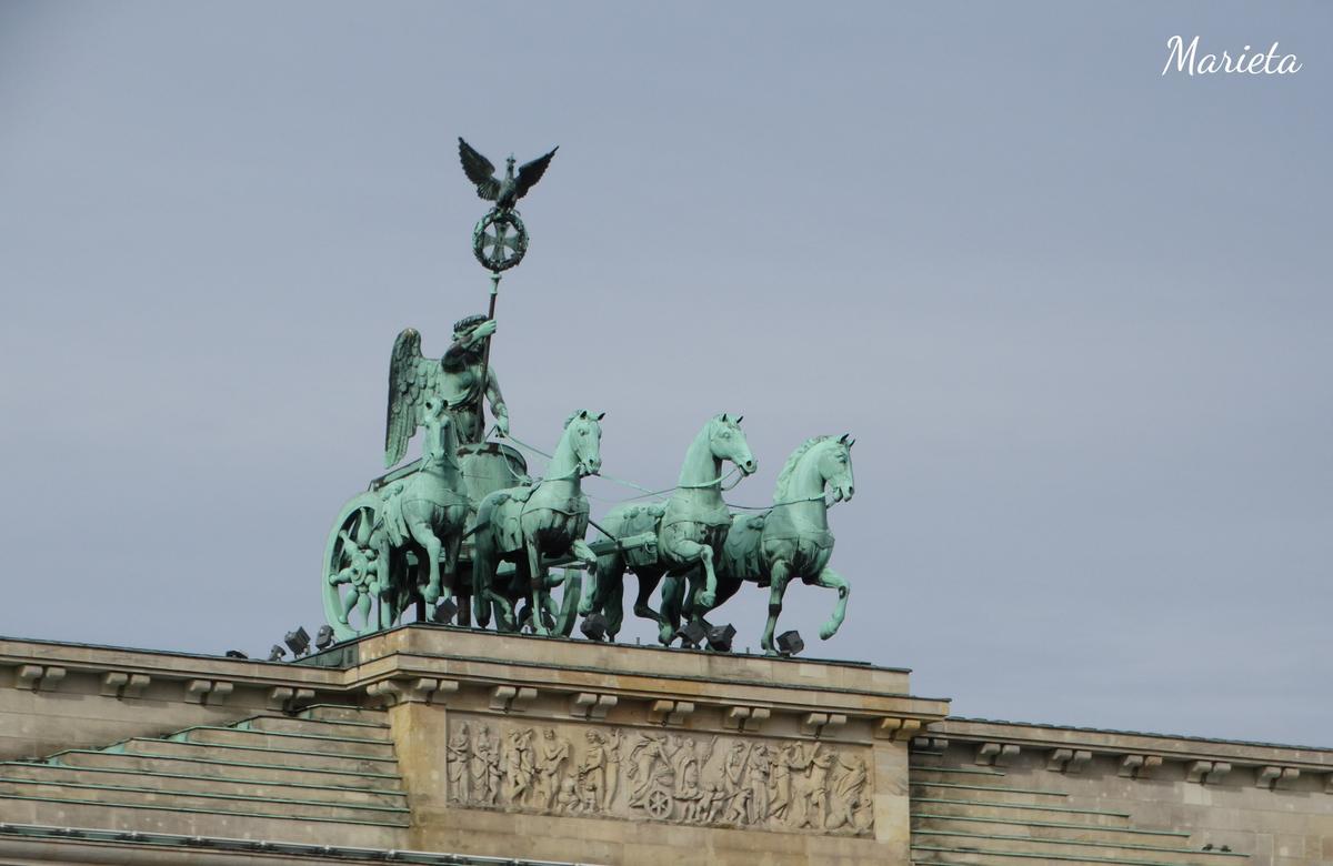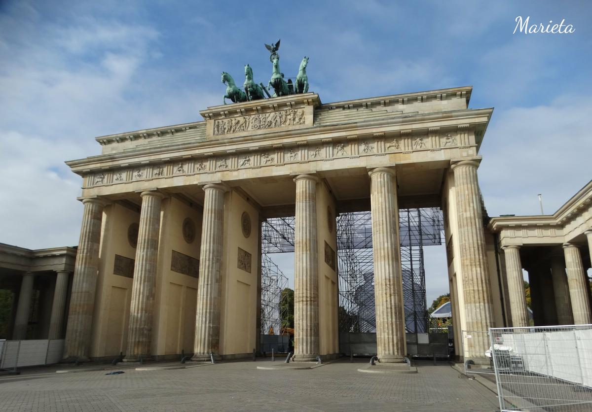 Comenzamos la visita a esta ciudad en la Plaza de París, donde se encuentra uno de sus monumentos más emblemáticos, la Puerta de Brandemburgo (Brandenburger Tor). Se construyó en 1789 copiando los propíleos de la Acrópolis de Atenas, y está coronada por una cuádriga de bronce que transporta a la diosa Victoria.
