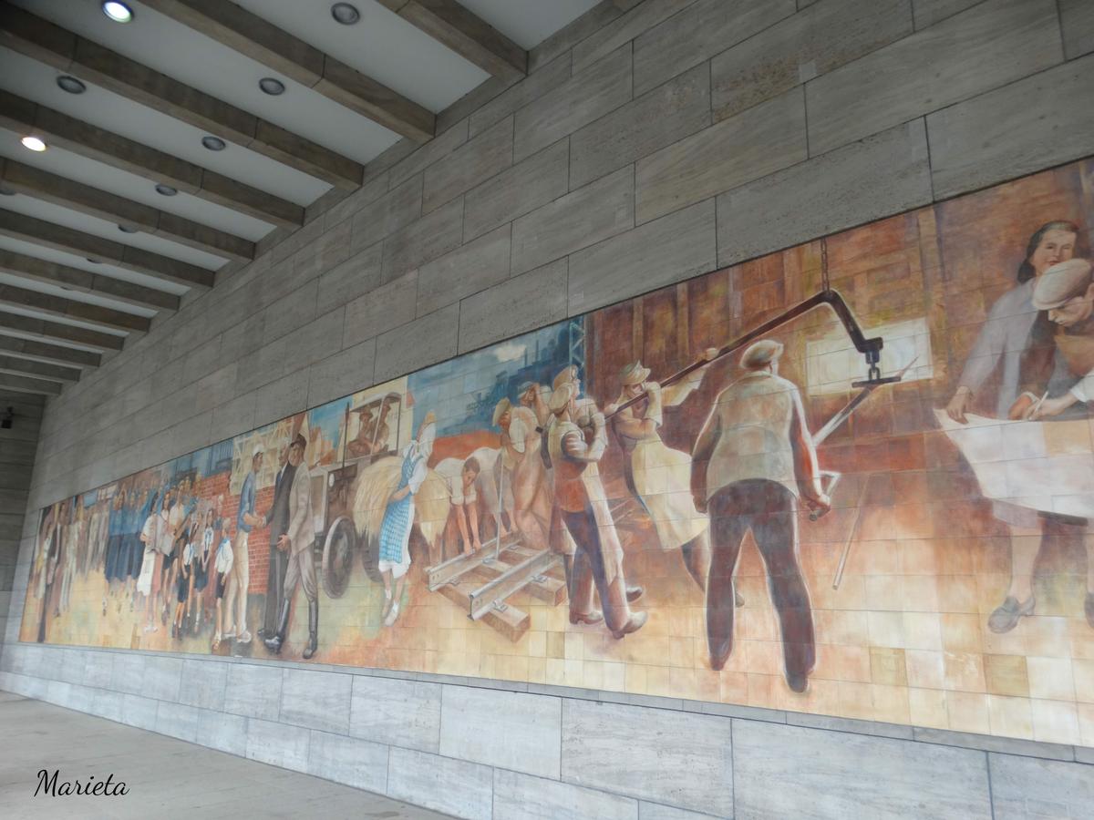 Posee un espectacular mural de baldosas de porcelana diseñado por el pintor Max Ligner, que refleja la propaganda del estado ideal de felicidad y realización del comunismo. Como contrapunto a este mural, justo enfrente encontramos una imagen de cristal incrustada en el suelo, se trata del “Memorial a los acontecimientos del 17 de junio de 1953”, de Wolfgang Rüppel. Una fotografía aumentada y muy pixelada de los huelguistas marchando ese día.