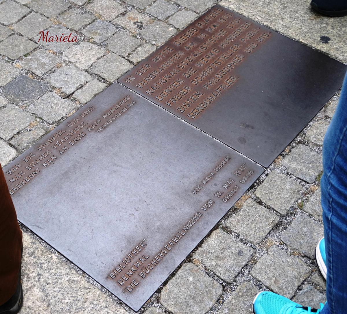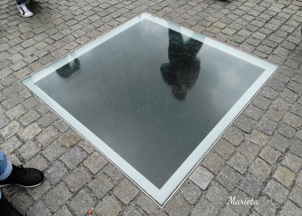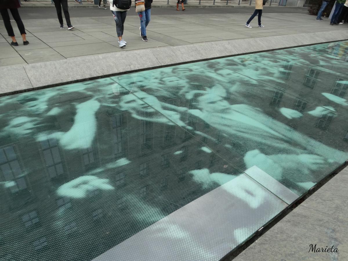 Seguimos nuestro camino hasta desembocar en la Plaza Bebel (Bebelplatz, antes llamada Opernplatz) tristemente famosa por ser el escenario de la Quema de libros del 10 de mayo 1933. Un sencillo memorial, obra del artista Micha Ullman, recuerda el hecho en el centro de la plaza: a través de un cristal incrustado en el pavimento se ven las estanterías vacías de una Biblioteca Hundida. Los libros que faltan simbolizan los que fueron quemados. Muy cerca hay una placa también en el suelo, con la inscripción de una frase del poeta alemán Heinrich Heine, que dice algo así: “Eso sólo fue un preludio, ahí en donde se queman libros, se terminan quemando también personas”