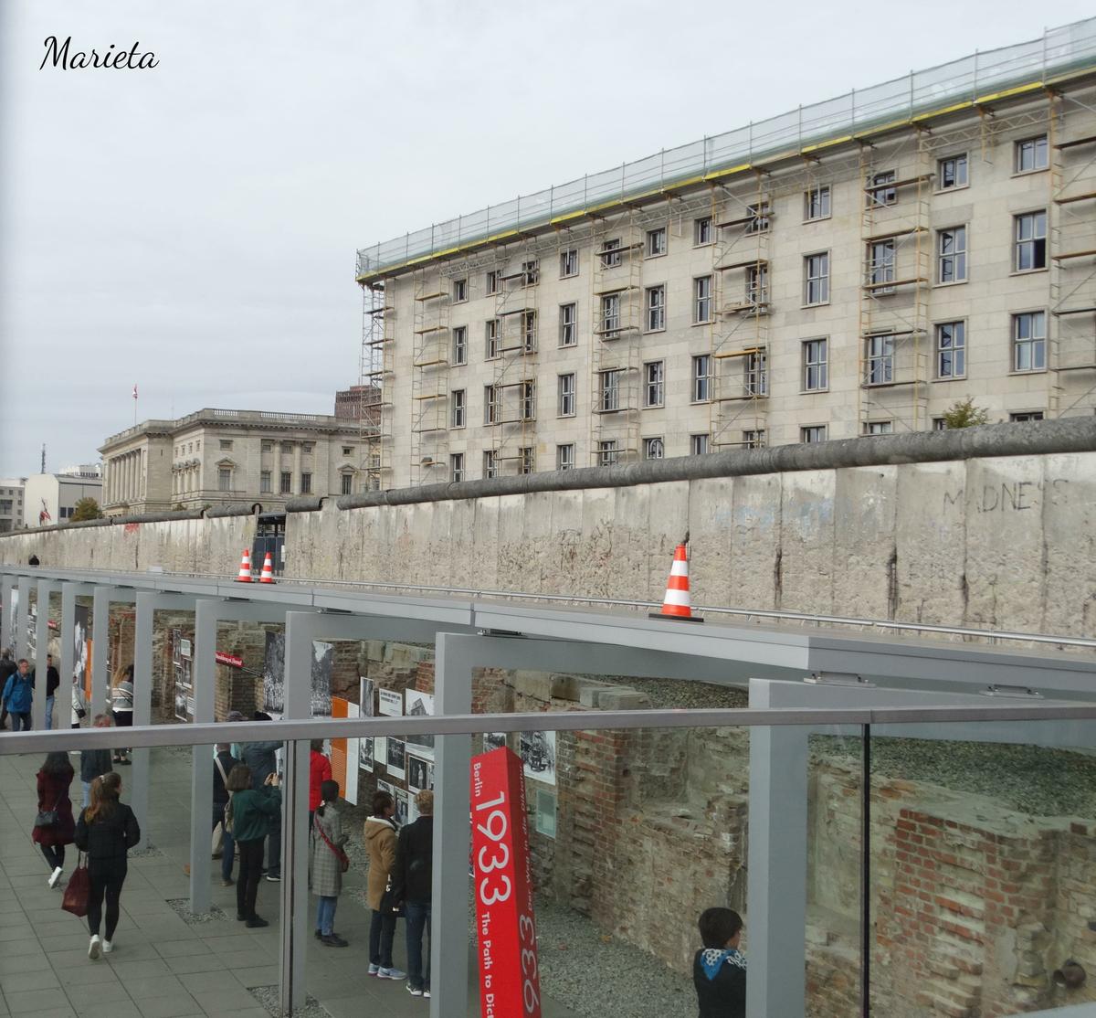 Continuando por Wilhemstrasse nos encontramos poco después con un gran tramo del muro original, de unos 200 metros. A sus espaldas, sobre lo que fue la antigua sede de la Gestapo, y que hoy es un moderno centro de documentación llamado “La Topografía del Terror” diseñado por la arquitecta Ursula Wilms, se alberga una sobrecogedora exposición sobre el horror nazi.