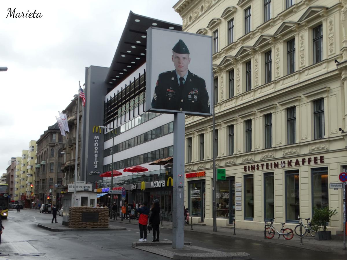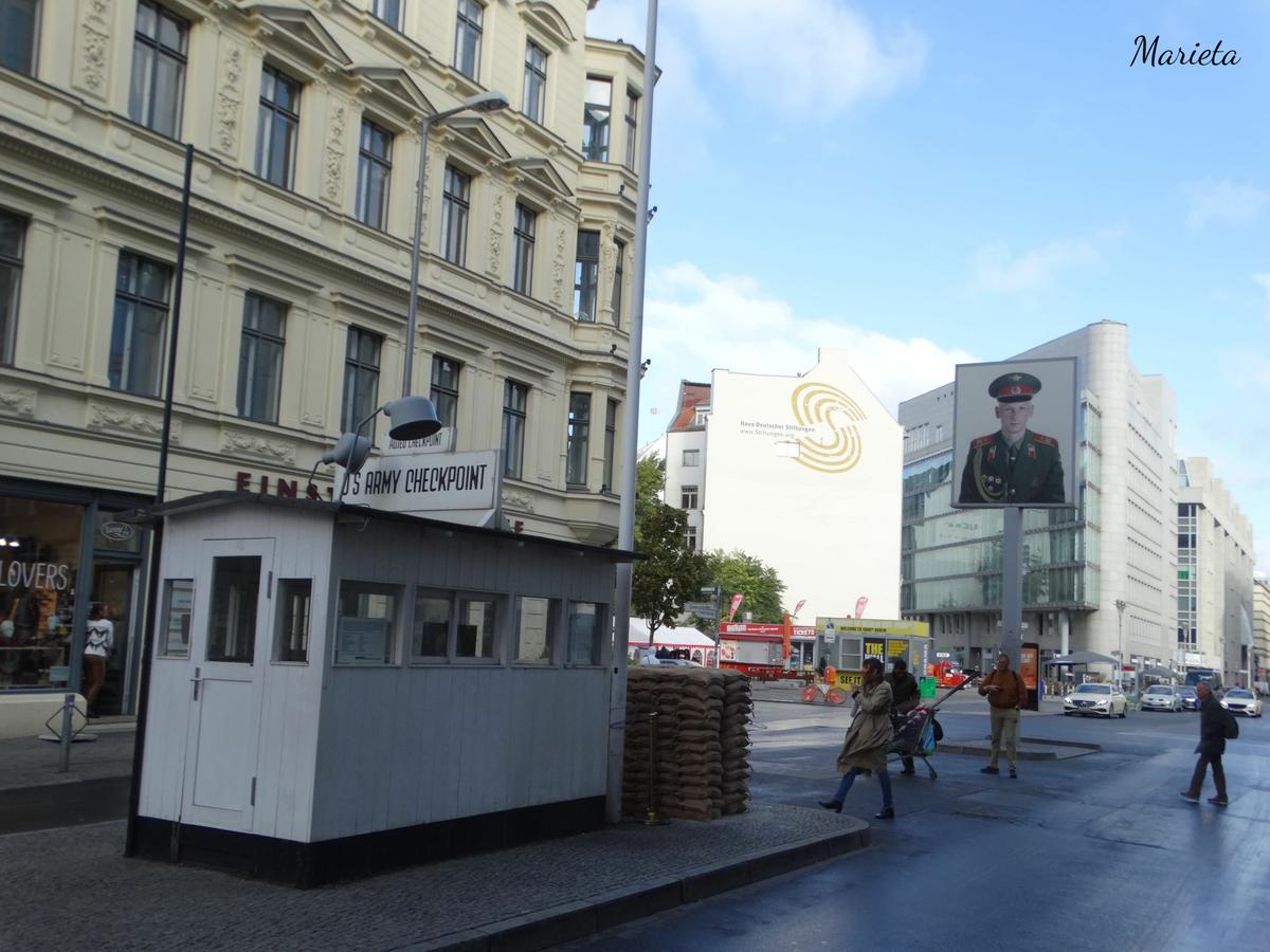 Se llamaban “Checkpoint” los pasos fronterizos abiertos en el muro, entre el sector americano y el soviético. El más famoso fue el “Checkpoint Charlie”, exclusivo para funcionarios y militares, en Friedrichstrasse. Escenario constante de las tensiones de la guerra fría. El doble retrato de un soldado soviético y otro yanki, y una reproducción de la caseta de control, marcan hoy el punto exacto donde estaba la frontera en medio de la calzada.