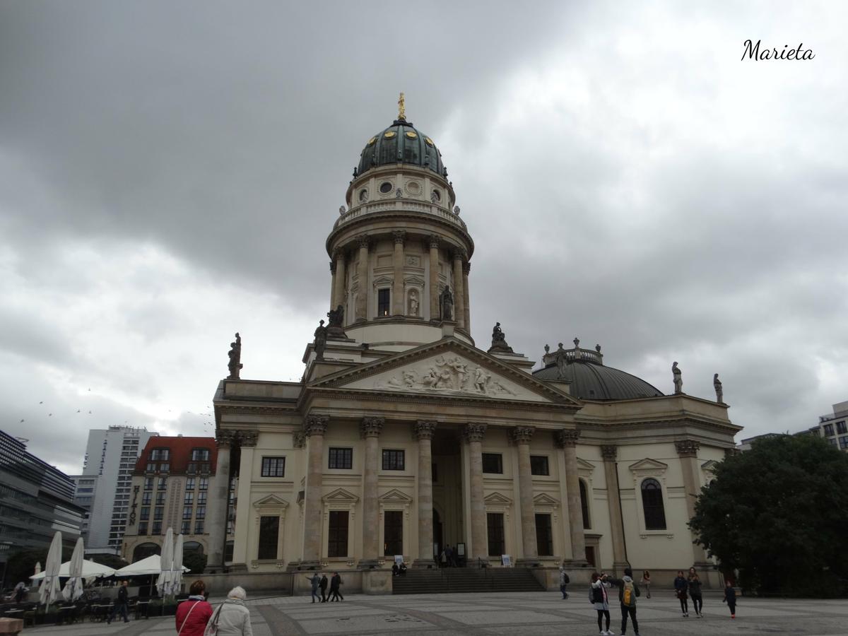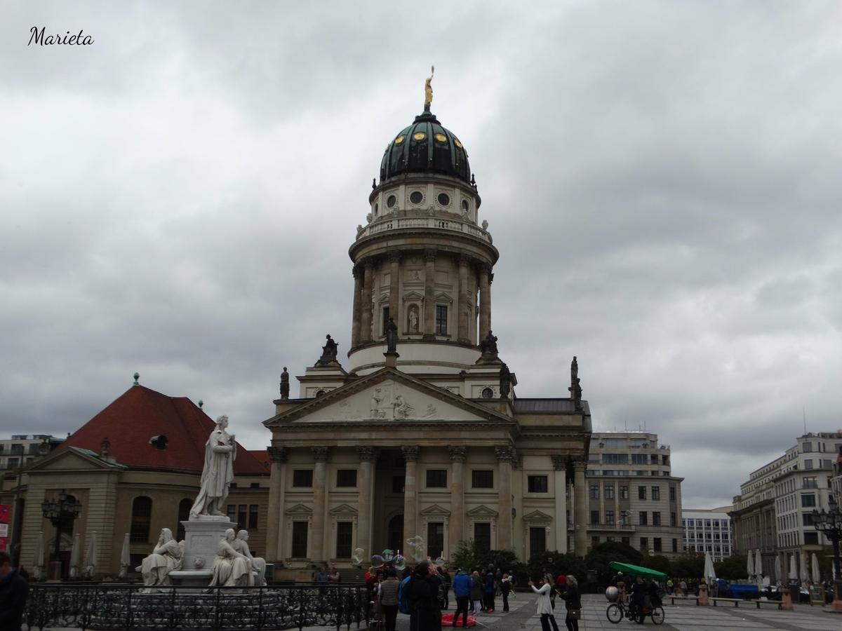 La Gendarmenmarkt es en mi opinión la plaza más bonita de Berlín. Debe su nombre al regimiento de gendarmes que entre 1736 y 1782 tuvo aquí un cuartel, un cuerpo de guardia, y los establos. A ambos lados de la plaza hay dos iglesias de trazas catedralicias: el Dom Francés construido en 1705 y el Dom Alemán o Iglesia Nueva, de 1708.