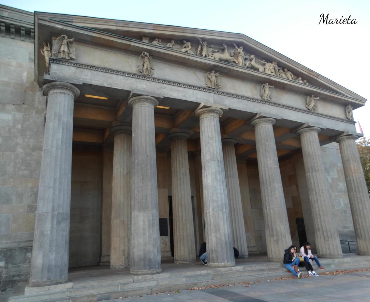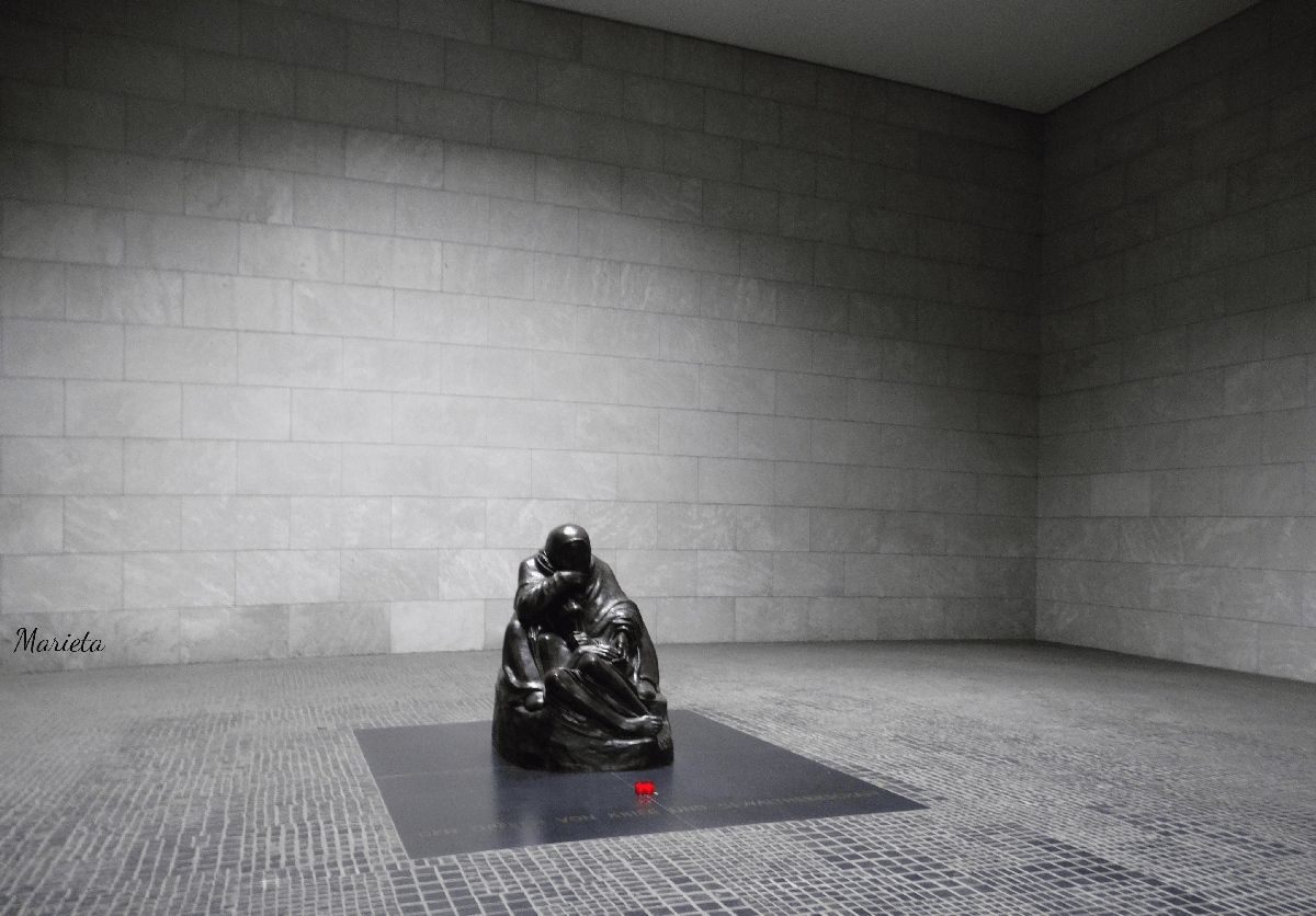 Entramos después en el edificio del Nuevo Cuerpo de Guardia, de estilo neoclásico y portal dórico, guarda en su austero interior y bajo una luz cenital, la conmovedora escultura de una Piedad de la artista Kathe Kollwitz, “Madre con hijo muerto”. El edificio se construyó para la guardia de palacio en 1814. Ha sido lugar de homenaje a las victimas de la primera guerra mundial, más tarde a las víctimas del nazismo, y en la actualidad es un monumento recordatorio a las “víctimas de guerra y dictadura”.
