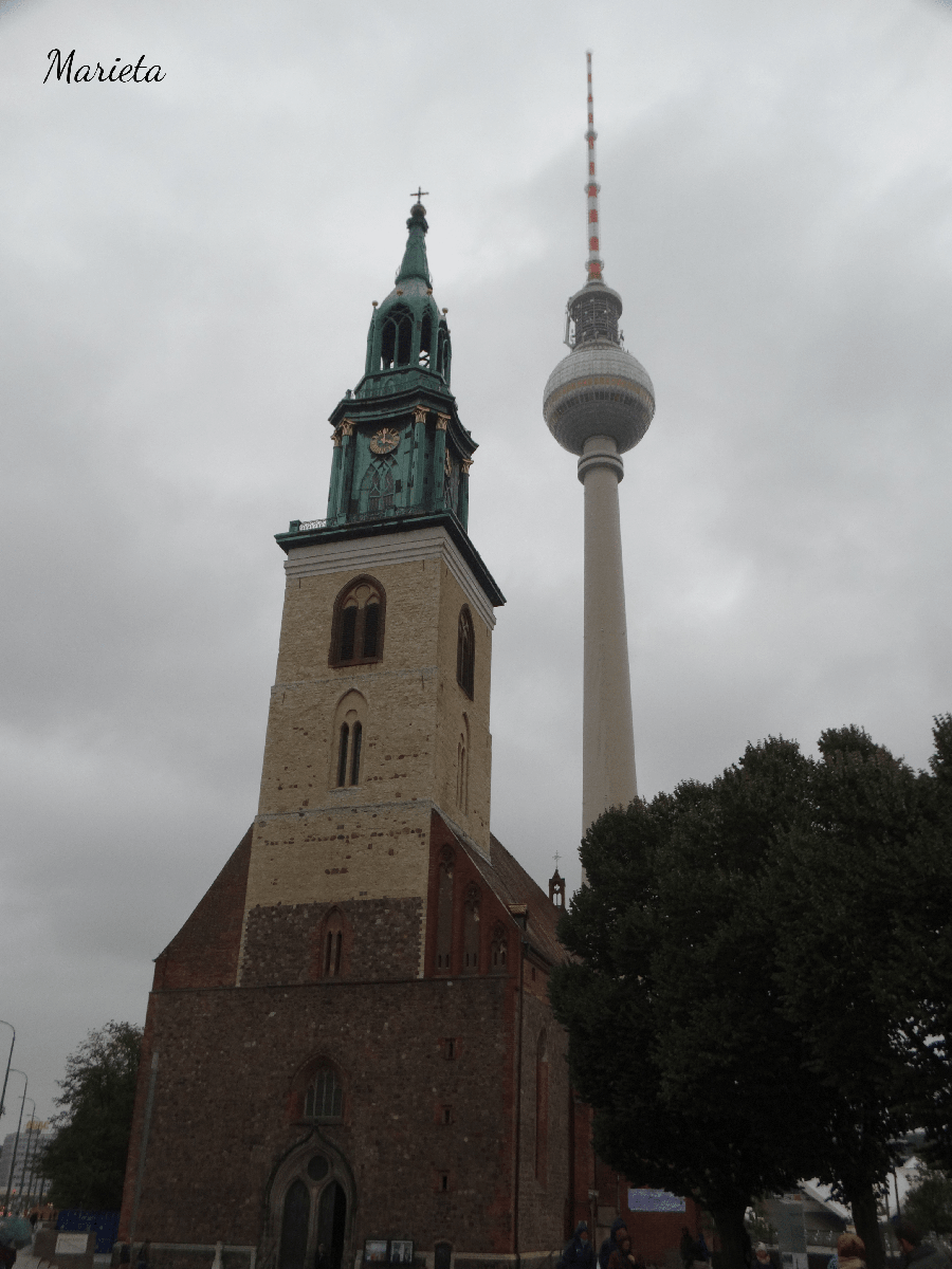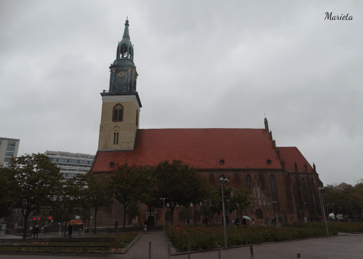 De camino a la Alexanderplatz, en medio del gran espacio llamado Forum de Marx y Engels, nos detenemos brevemente para visitar la Iglesia de Santa María, una de las más antiguas de Berlín. De estilo gótico y construida principalmente de ladrillo, fue fundada en 1260 y renovada en el siglo XIV. Sufrió importantes daños durante la Segunda Guerra Mundial.