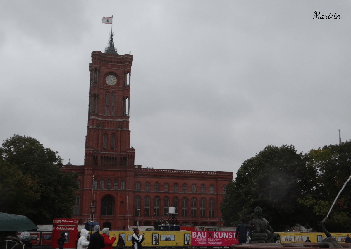 Al otro lado está la Fuente de Neptuno que Berlín regaló al Káiser en 1888 para el patio del palacio real. El Ayuntamiento Rojo, llamado así por el ladrillo con el que fue construido en 1869. Y cerrando el foro, junto a Alexanderplatz, la Torre de la Televisión, con sus 365 metros de altura. La bola de la cúspide gira a razón de dos vueltas por hora, está recubierta por 140 segmentos de acero pulido en el que los reflejos del sol forman una cruz luminosa.