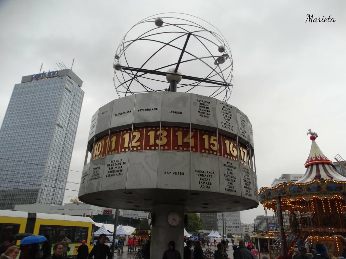La lluvia hace acto de presencia y nos obliga a terminar nuestro paseo antes de lo previsto cuando llegamos a Alexanderplatz. Las últimas fotos del día nos las hacemos junto al Reloj de la hora mundial, kilómetro cero de las citas berlinesas. Fue en esta plaza donde , el 4 de noviembre de 1989, tuvo lugar la gran manifestación que dio al traste con el gobierno de la RDA, propiciando que cinco días después se abriese el Muro de Berlín.