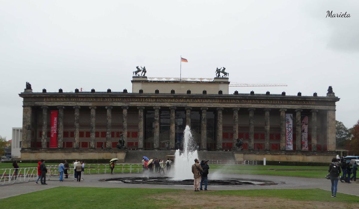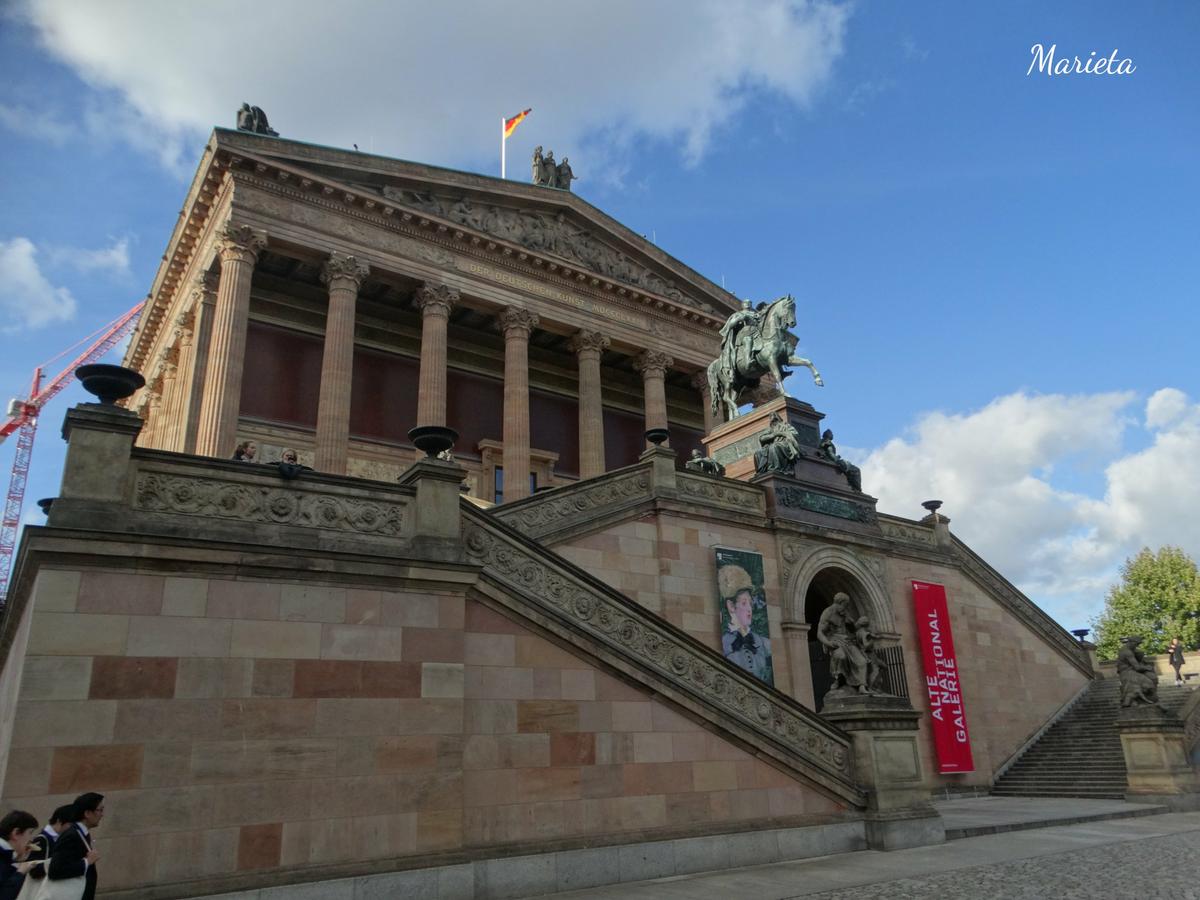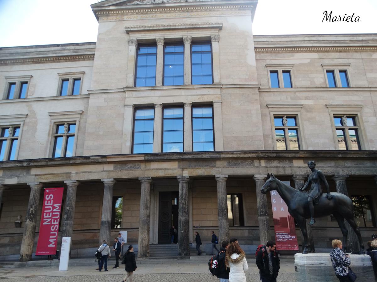 La mañana de nuestro segundo día en Berlín decidimos emplearla visitando dos de sus museos más emblemáticos. En pleno centro urbano, en la isla del río Spree, estaban las dos aldeas medievales que originaron Berlín. Hoy es conocida como la Isla de los Museos, por su impresionante patrimonio. Al norte de la isla está el extraordinario conjunto de cinco museos a los que debe su nombre: el más antiguo, El Museo Viejo (Altes Museum), se construyó en 1830; el Museo Nuevo (Neues Museum) data de 1855; a su lado está la Galería Nacional Antigua (Alte National Galerie) de 1876. Detrás está el más grande, el Museo de Pérgamo (Pergamon Museum) terminado de construir en 1930, y al borde norte de la isla, el Bode Museum, construido en 1904.