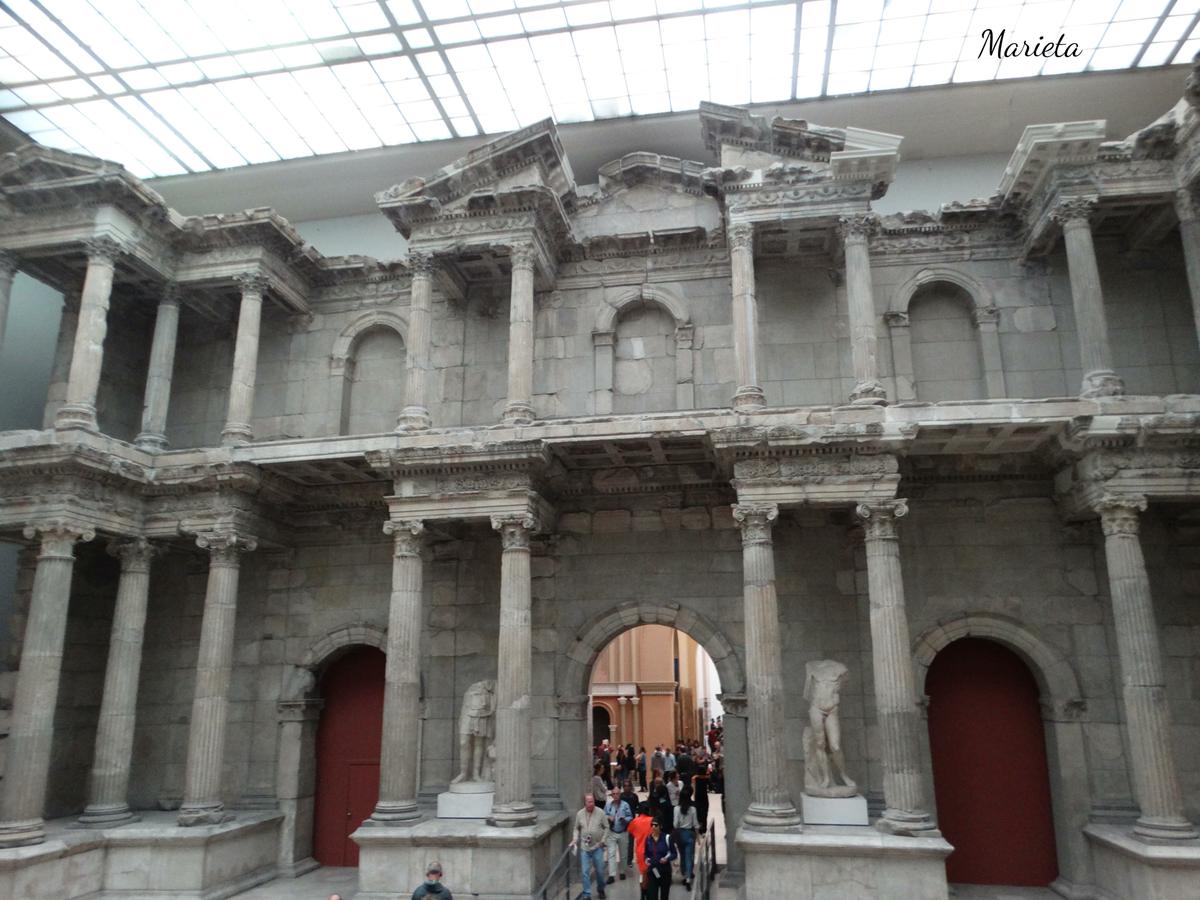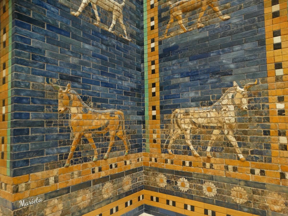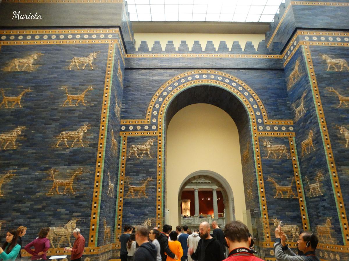 Empezamos nuestra visita por el Museo de Pérgamo, en él no sólo se exponen esculturas, sino edificios enteros procedentes de las excavaciones de arqueólogos alemanes en Asia, durante el siglo XIX. Debe su nombre al Altar de Pérgamo que lamentablemente no pudimos ver debido a las obras que se están realizando en buena parte del museo, y que no concluirán hasta posiblemente el 2023 ( la excusa perfecta para repetir visita a Berlín ). Sí pudimos admirar la grandiosa Portada del Mercado de Mileto ( del siglo II d.C.), la maravillosa Puerta de Isthar (550 a.C.), La Avenida Procesional con el friso de los leones y el Toro de Adad (siglo VI a.C.)