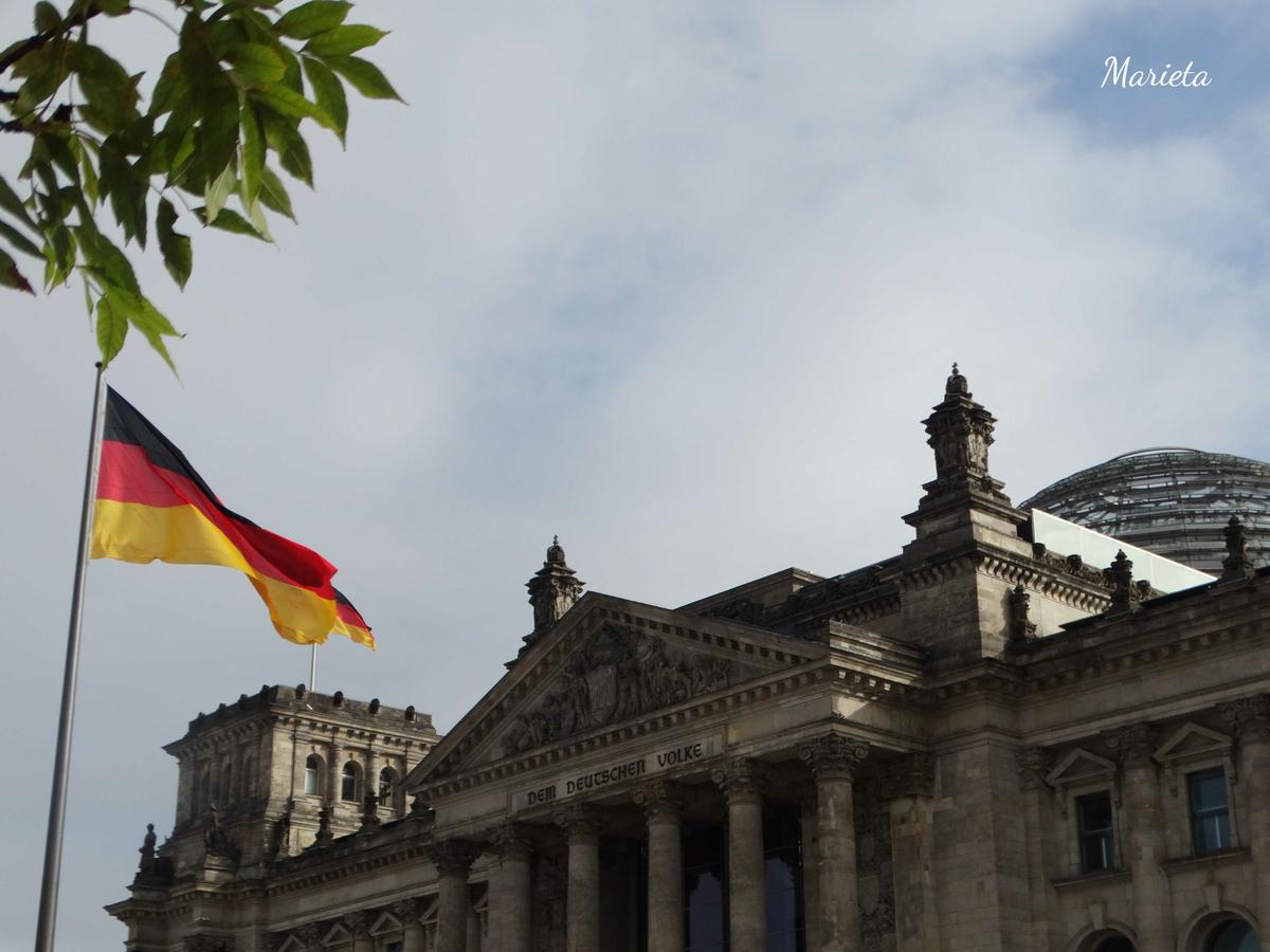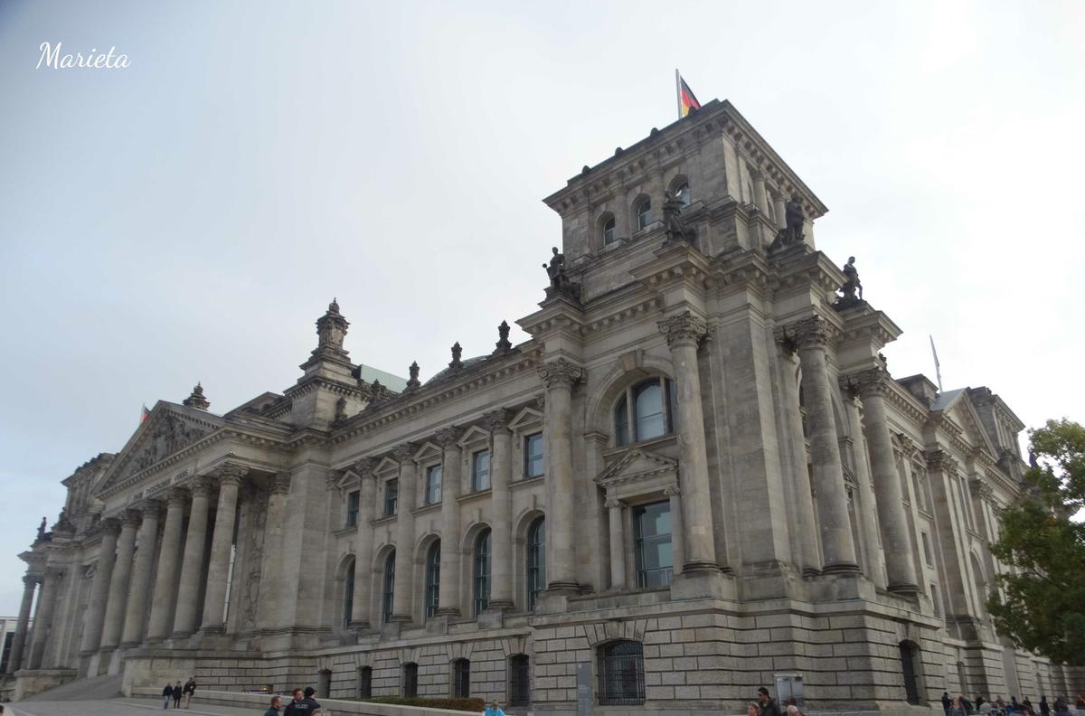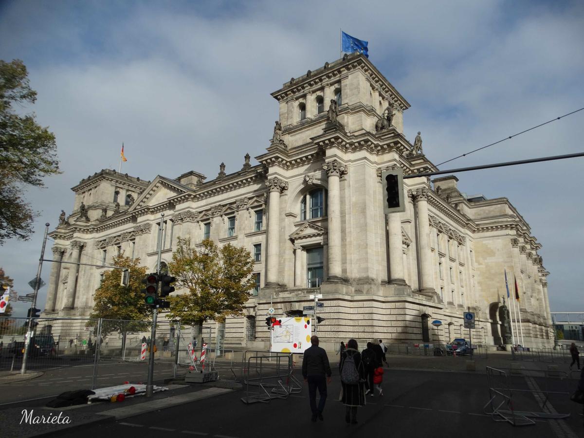 La mañana del tercer día acudimos temprano al edificio del Reichstag, porque es necesario reservar la visita a su cúpula con antelación, o bien por internet o bien acercándose al kiosko de taquillas como hicimos nosotros. Reservamos para el último pase, el de las 21:45. Comenzado a construir en 1871, cuando Berlín fue proclamada capital del imperio alemán, no se terminó hasta 1894. Tiene planta casi cuadrada con torres en las cuatro esquinas. La inscripción Dem Deutschem Volke, “Al pueblo alemán” se puso en 1915. En 1933 fue incendiado. Los nazis acusaron del incendio a los comunistas, y aquella noche fueron ejecutados 10.000 izquierdistas. Después de la guerra, el Muro tapiaba su fachada trasera y quedó abandonado. En 1993 se encargó su reconstrucción a Norman Foster.