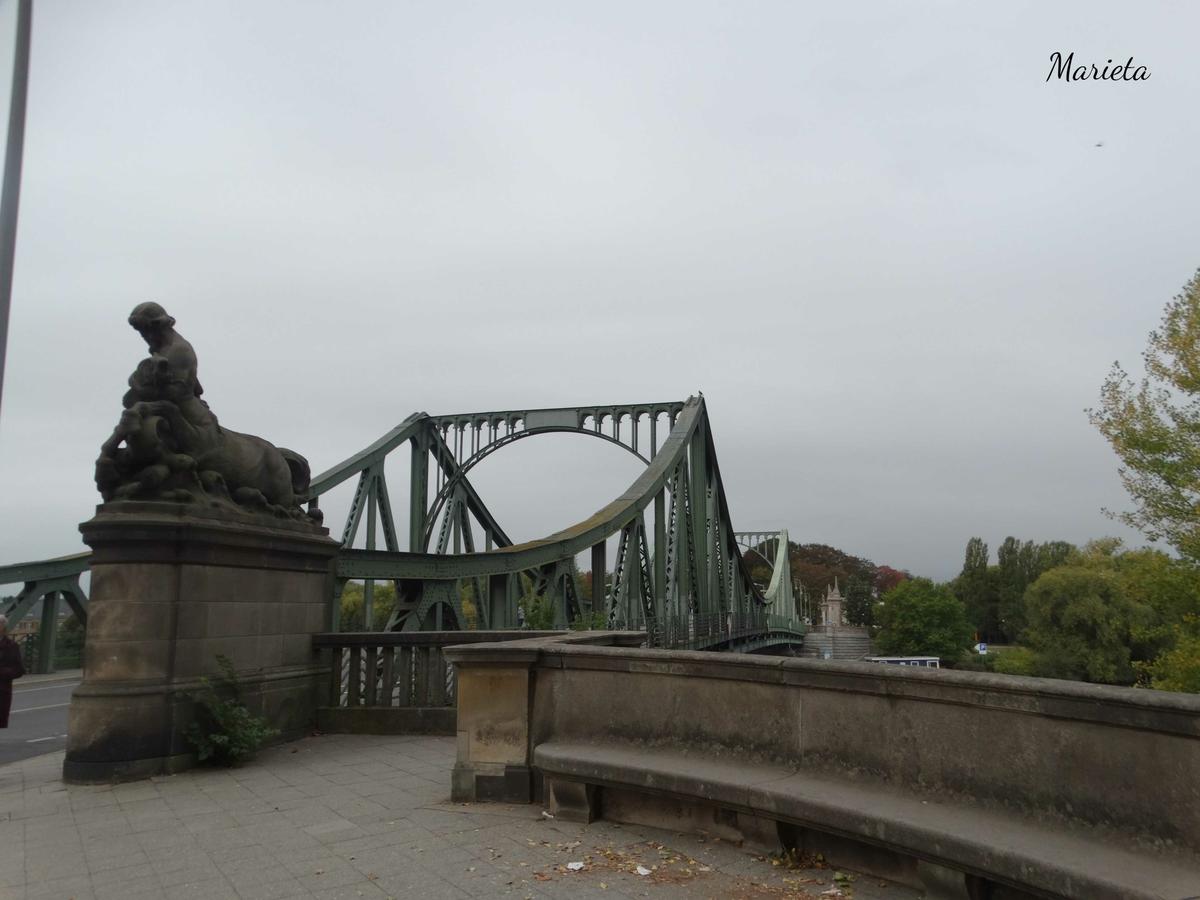 Regresamos al entorno de la Plaza de París, y de la mano de nuestro guía Javier de Sandemans, bajamos a la estación de metro para tomar el tren de cercanías que nos llevará a Potsdam. Tras unos 40 minutos de viaje y unas cuantas paradas, nos bajamos en la de Vannsee y allí tomamos el autobús 316 hasta el Puente Glienicker, llamado “Puente de los espías”.