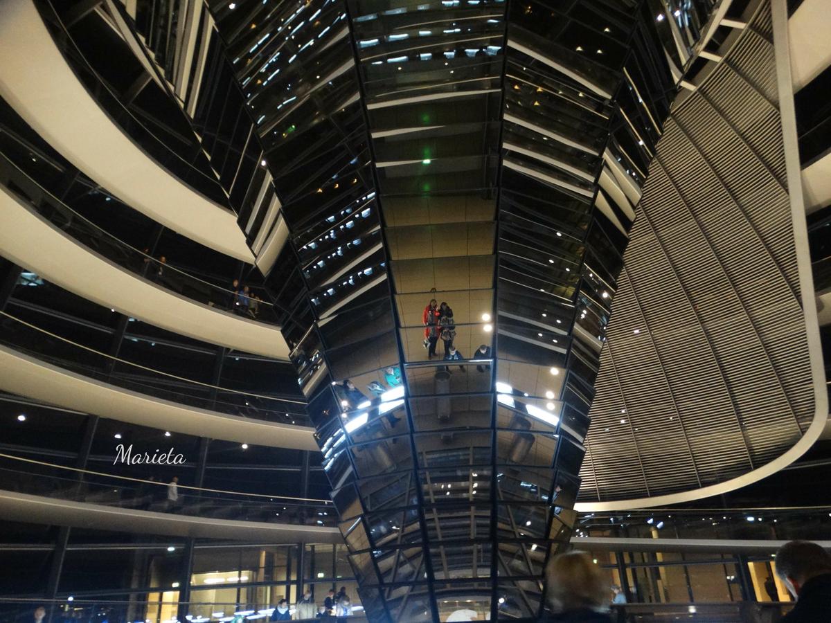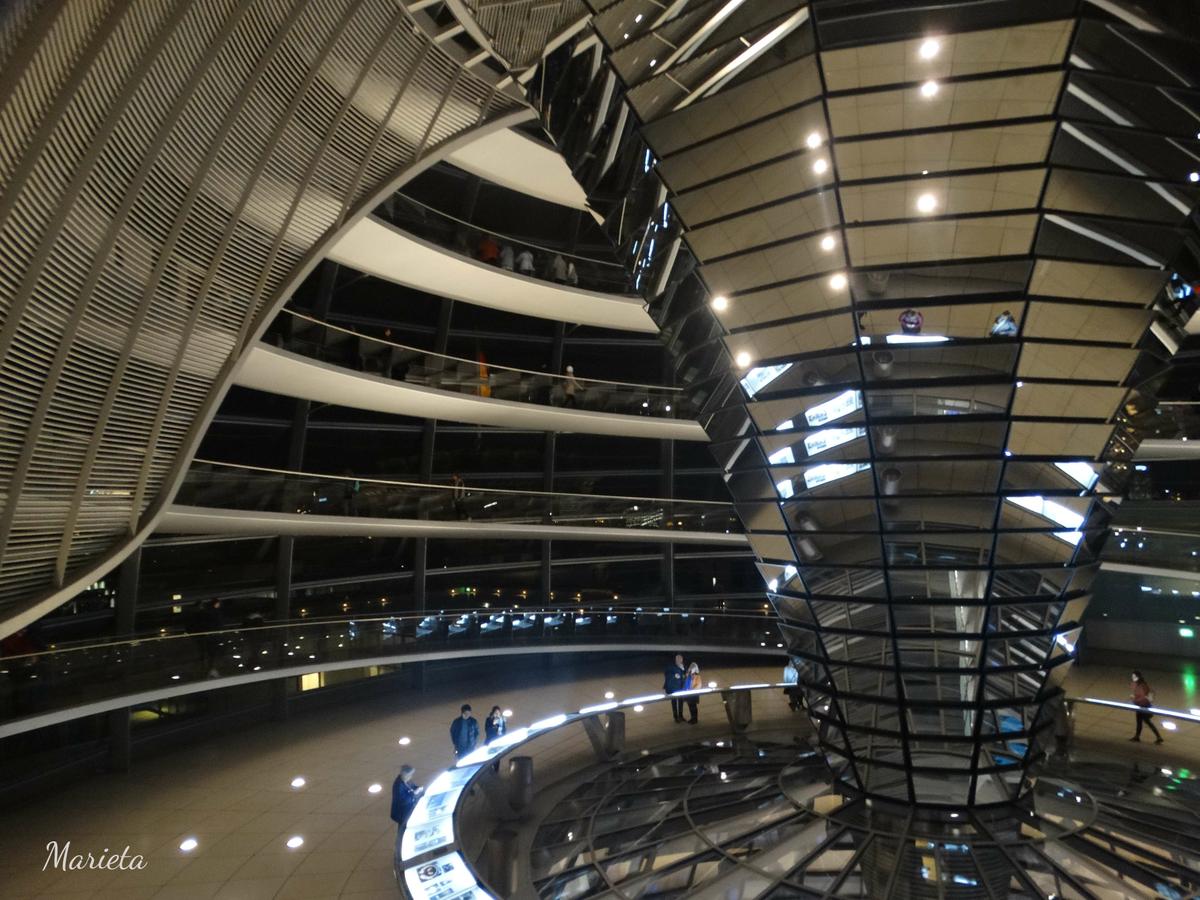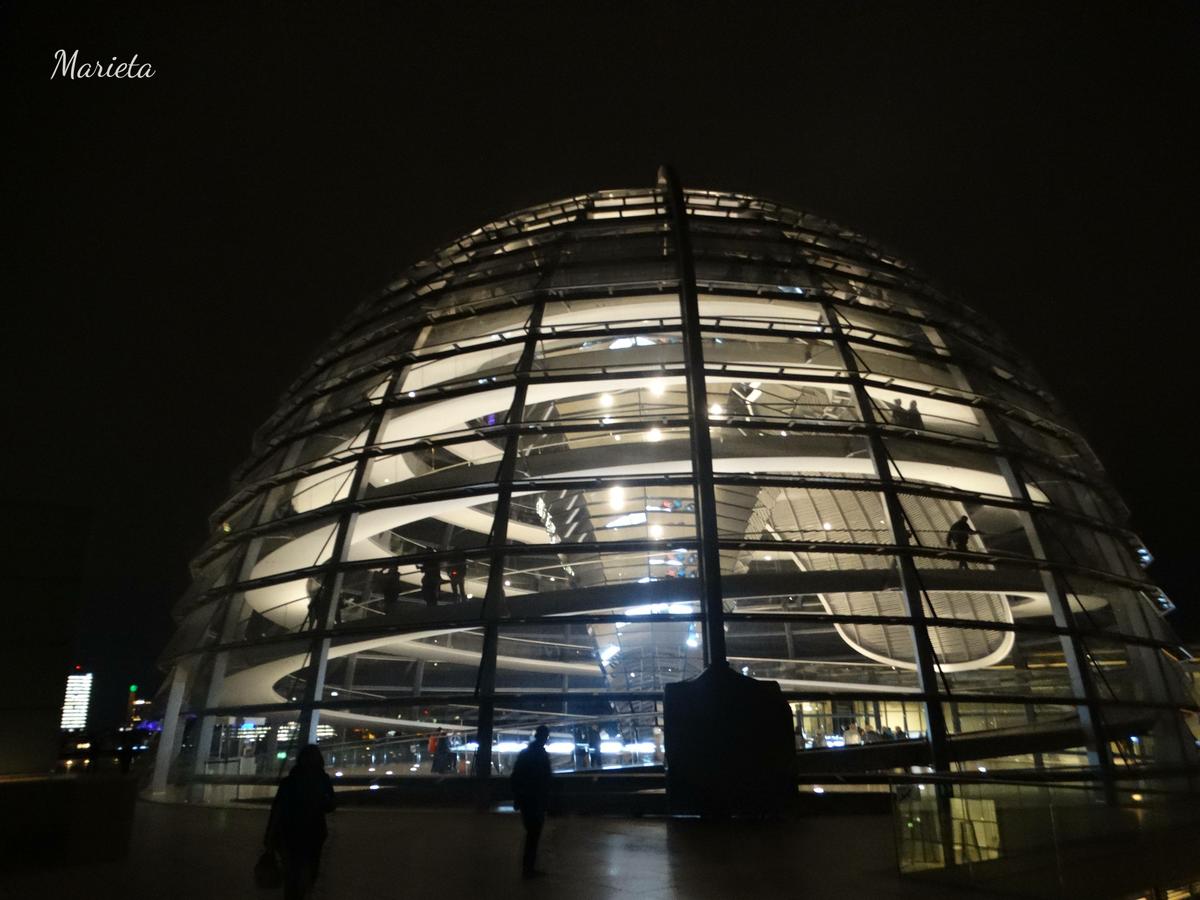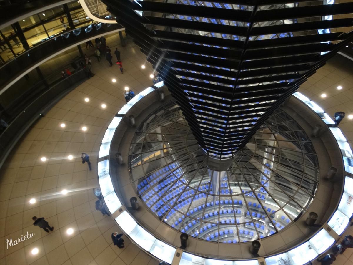 Click to view slideshow. Poco a poco va oscureciendo y se acerca la hora concertada para visitar el Reichstag y su impresionante cúpula. Después de pasar un exhaustivo control, semejante al de un riguroso aeropuerto, comenzamos por fin la visita gratuita ayudados de una estupenda audioguía. La cúpula es transparente y, en su centro, una vela solar forrada de espejos en forma de embudo, aporta luz natural y aire durante el día y, por la noche, refleja hacia afuera la iluminación interna.
