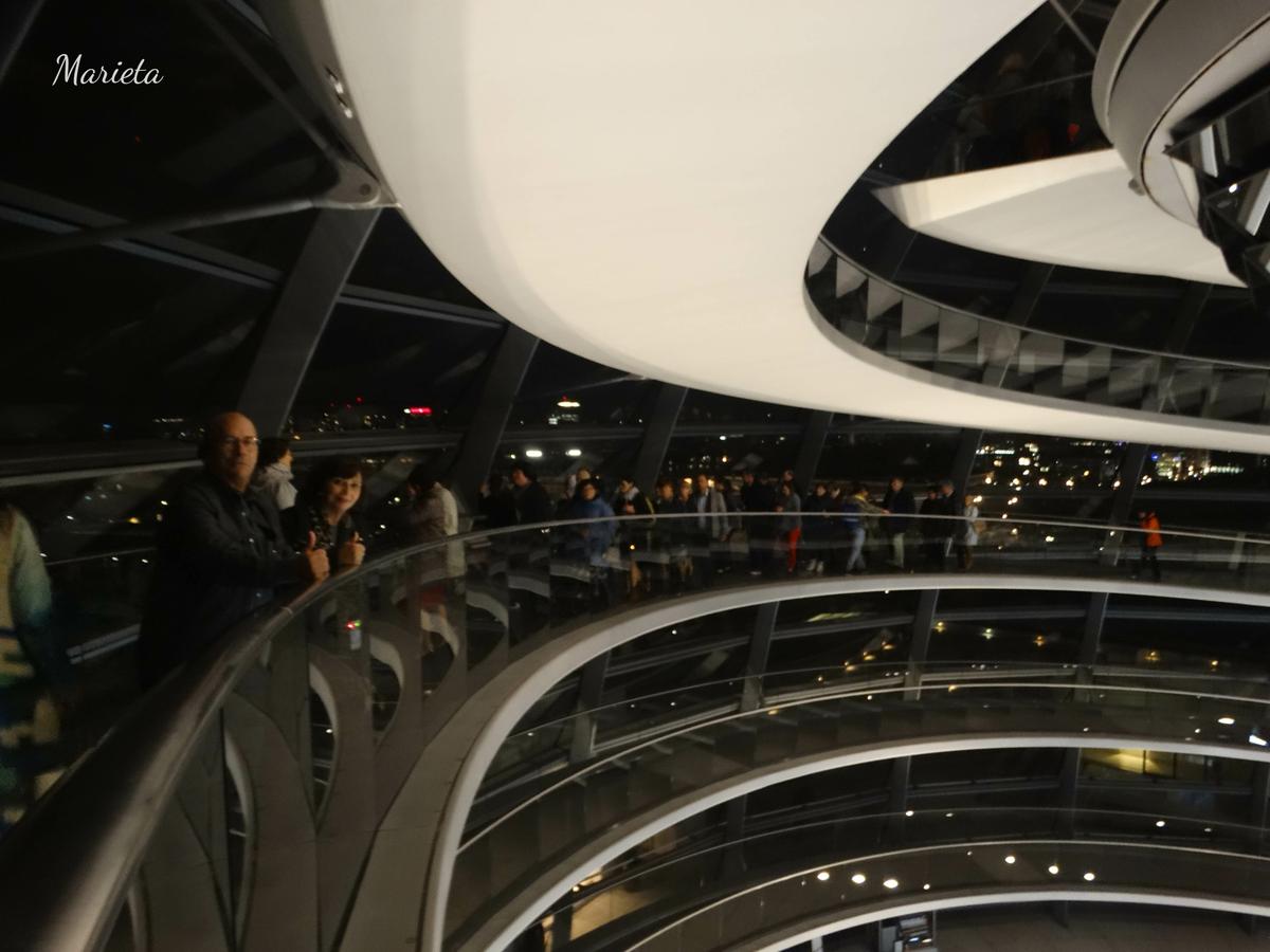 Una doble rampa de subida y bajada lleva a lo alto de la bóveda, desde donde pudimos contemplar unas espléndidas vistas nocturnas de la ciudad, así como el lugar de trabajo de los parlamentarios.