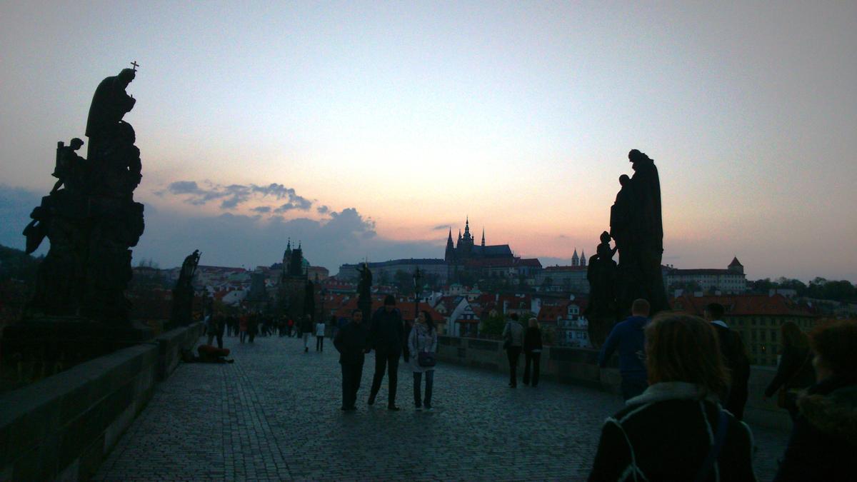 La tarde avanza y poco a poco va anocheciendo cuando nos acercamos al Puente de Carlos, un puente que cruzaremos innumerables veces en los próximos días y que ahora, con las últimas luces del atardecer, ofrece un aspecto totalmente distinto al que veremos en las horas centrales del día.