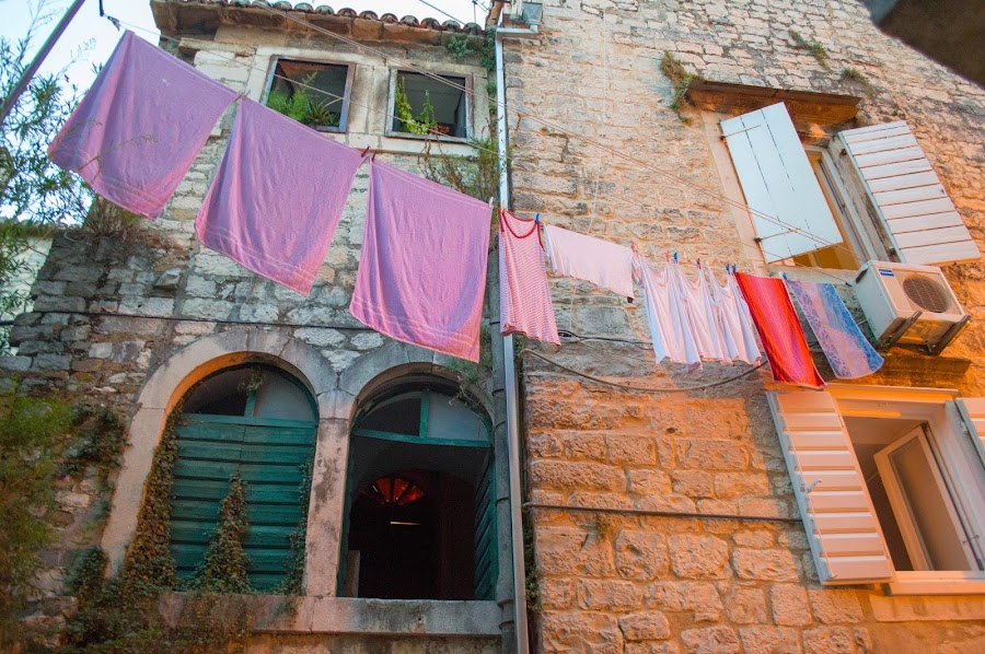Me llamó la atención el contraste de la ropa colgada en las casas de piedra y el suelo adoquinado. Algunas colgaban en la propia fachada pero otras se unían con la casa de enfrente.