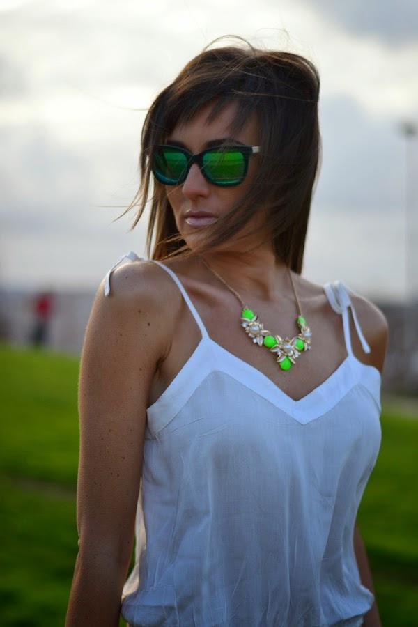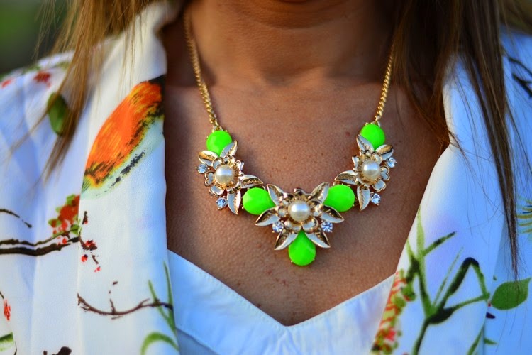 Como complemento, un llamativo collar dorando con piedras en vibrante verde lima que contrasta a la perfección con un tono de piel bronceado (ideal por tanto para el verano si lo que queremos es causar un gran impacto visual en el escote).