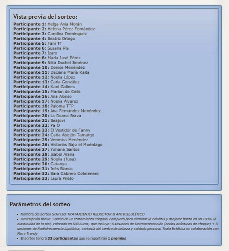 así como el listado definitivo de participantes (véase debajo) que habéis optado al premio de este tratamiento corporal completo para eliminar la celulitis y mejorar hasta en un 100% la elasticidad de la piel, en el sorteo realizado ayer jueves a través de Sortea2 y cuyas bases publicaba aquí el martes día 10 de marzo.