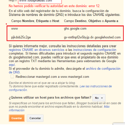 -Luego de ello saldrán un par de códigos o registros que proporciona Blogger y deben ser copiados para la configuración DNS y añadidos (pegados) en el registro CNAME al acceder a su Administrador de DNS de Godaddy. Es bastante sencillo incluirlos y guardarlos pero de todos modos, una vez en la página de Godaddy si hubiera algún inconveniente, puede pedir asistencia técnica al soporte vía telefónica que lo solucionará.