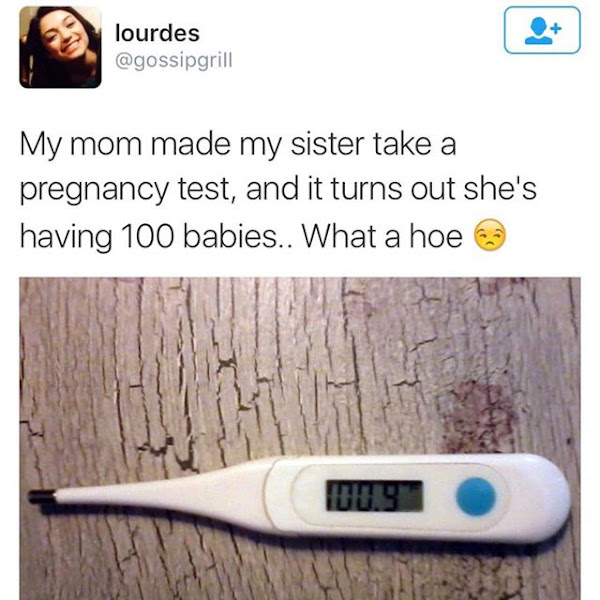 "Mi mamá le hizo una prueba de embarazo a mi hermana, y resultó que va a tener 100 bebés… Que zorr*"