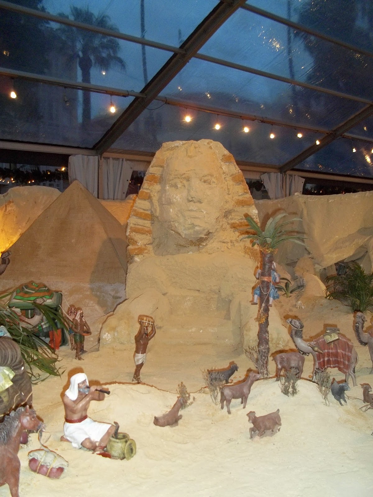 aquí vemos en el final del recorrido a la Virgen llevándose al niño por el desierto en la burrita a través de las esfinges y grandes pirámides que llevan un gran trabajo y esfuerzo por parte de los montadores a los que, en ocasiones, los cartageneros dejan monedas pidiendo un deseo para estas fiestas y que, al finalizar, los montadores donan a asociaciones benéficas como Cáritas o Cruz Roja