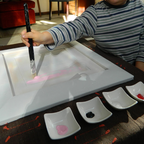 Cuando comencé a blanquearlo tenía claro lo que quería hacer: un proyecto de reciclado para decorar frugalmente y compartir con Camilo el espíritu de cuidado ambiental que roguemos conserve por mucho tiempo más. Tenía que ser un diseño sencillo, realizable con la motricidad fina de un niño de cinco años y de una zurda que está -año más, año menos- al mismo nivel. Además. debíamos adaptarnos a los colores de acrílico a disposición: blanco, negro, rojo y rosa. Claro que si me dejaban a mí, la transformación habría sido más neutra y ahora tendría un cuadro reciclado en blanco, negro y gris. Pero tengo un hijo que es una explosión de color y me anima a re-considerar mi tendencia monocromática. Si él es feliz con los tonos vibrantes y los brillos, puedo manejarlo.